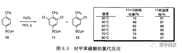 理想的反应温度就是在可接受的反应时间内得到高品质的产品。升高温度通常可提高反应的速率,但同时升高温度也会降低反应的选择性。在考察理想反应时间的时候,一方面考虑该反应要达到适当的反应值;另一方面要考虑在规模化生产时减少反应设备占用时间,两者之间要达到一种平衡。图8.6描述了温度的变化在对甲苯磺酸的氯代反应中对转化率和选择性的重要性[5],反应都进行4小时,60°C时收率最高,80°C 时收率降低,因为在80°C时H2O2分解的速率要比H2O2与HCI的反应速率要快。但温度从60"C升高到80C时反应的选择性基本没有变化。