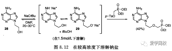 ,故而优化反应浓度也许可以促进产物高收率、高纯度的分离。如果时间允许,改变反应的浓度也许会得到更加好的结果。例如图8. 12所示例子,在浓度为1. 5mol/L时,向腺嘌呤衍生物28滴加叔丁醇钠可以得到透明的溶液,但在0.8~1.0mol/L时钠盐29就会以粘稠物的形式沉淀出来。高浓度时形成溶液似乎不合情理,或许高浓度的29和副产品叔丁醇是溶解中间体的关键。