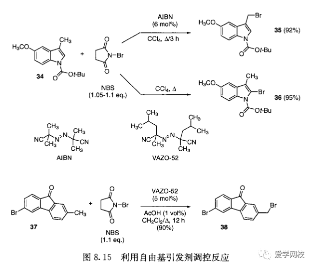 通过加入适当的试剂来“调控”反应活性从而达到优化某些反应的目的。使用这种方法优化反应时,弄清反应的机理就显得尤为重要。在自由基引发剂AIBN的作用下对化合物34进行溴代反应(图8. 15),以较高收率得到吲哚类化合物35。而化合物36的制备过程中就不需要AIBNI[8]。在自由基引发剂VAZO-52的作用下对化合物37进行溴代反应,得到化合物38 (图8. 15)。自由基引发剂在不同的温度下会发生分解,所以需要根据不同反应温度下物的半衰期来选择合适的自由基引发剂。[AIBN和VAZO-52]