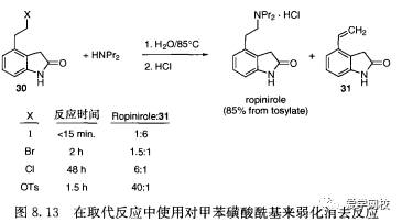 化学工作者可能会利用一些以前文献报道的方法通过改变底物和中间体来进行工艺优化。在合成ropinirole (罗平尼咯一种治疗帕金森氏症)时(图8.13),在化合物30上尝试了各种离去基团,都会得到消去反应的副产物31。但当对甲苯磺酰基取代的30与二异丙胺反应时就可抑制消去反应的发生以较高的收率得到ropinirole。