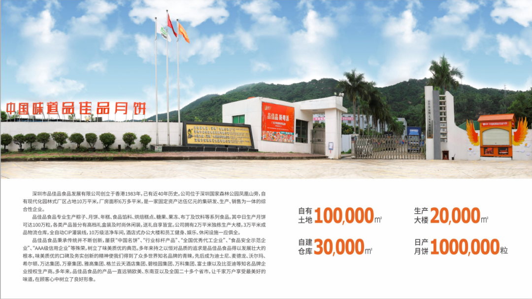 深圳市品佳品食品发展有限公司的前身成立于1983年,坐落于风景优美的凤凰山森林公园脚下,是一家拥有固定资产达5亿元的综合性企业集团。品佳品食品(深圳)有限公司是品佳品(香港)集团在国内的独资企业。公司地处深圳市宝安区,自有土地10万平方米,拥有花园式现代化食品生产工厂五个(月饼烘焙厂、馅料厂、蛋卷糖果厂、果冻饮料厂、橡皮糖厂),拥有高标准生产厂房六万多平方米,现有各类中、高级管理和专业技术人才八十多人,并拥有行业领先的自动成型、烘焙、包装一体化生产线,并从国外引进了部分全自动生产设备。