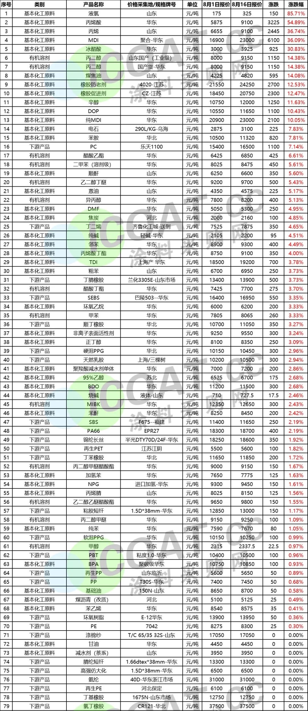 环氧氯丙烷:多数生产企业新单报盘大稳小动,部分地区卖盘出货不畅,新单报盘可商谈,下游跟进谨慎,业者多关注场内装置开工变动。丙烯:山东丙烯市场主流参照6800-6800元/吨。供应下降预期保持,生产企业低位报盘调涨跟进,市场成交重心继续走高。但下游聚丙烯需求持弱,本压力上升,工厂采购积极性不佳,高位接受度仍然一般,丙烯市场上涨幅度较为受限。苯酐:原料邻苯市场高位运行,工业萘市场企稳运行,成本端支撑尚可,且相对低位下,下游补货动作伴随,交投量有所释放,工厂现货趋紧。二氯甲烷:市场价格基本保持稳定,个别价格小幅上涨但涨幅较低,价格涨至高位之后市场看空气氛十分明显,虽然不断有利好信号刺激市场,但市场整体氛围仍偏向看空。山东地区当前销售压力较大,企业垒库速度较快,预期下周上半周将有压力出现,而广州及周边一带当前库存偏低,价格调整或略滞后于山东。正丁醇:继丁醇连续上行之后,因装置检修预期提振仍存,下游逢低采购积极性依旧较好,短期正丁醇偏强运行可能较大。丙烯酸及丁酯:在原料丁醇连涨及多数酸酯产品现货供应偏少的提振之下,酸酯持货方集中涨价,提振下游部分刚需入市,交投重心存不同程度上行。原料丁醇偏强运行的概率较大,预估酸酯市场将延续涨价趋势,不过需关注下游对迅速上涨后的新价格的接受程度。据不完全统计,自8月份以来,国内化工原材行业价格涨势大于跌势,总体行情有所恢复,但较2022年同期相比,仍处于底部位置。根据市场变化,涂料采购网整理了70多种的材料价格涨幅榜,具体如下:
