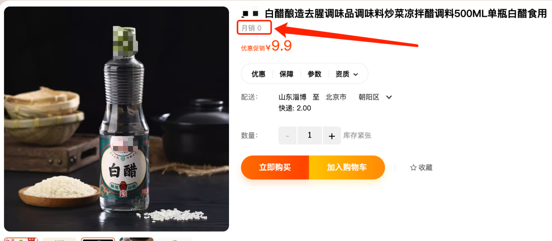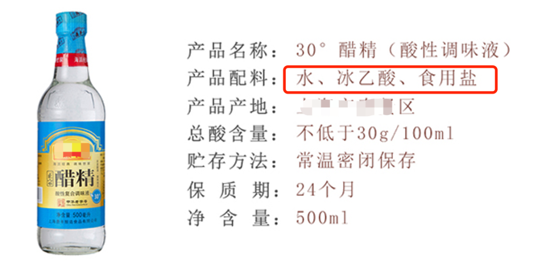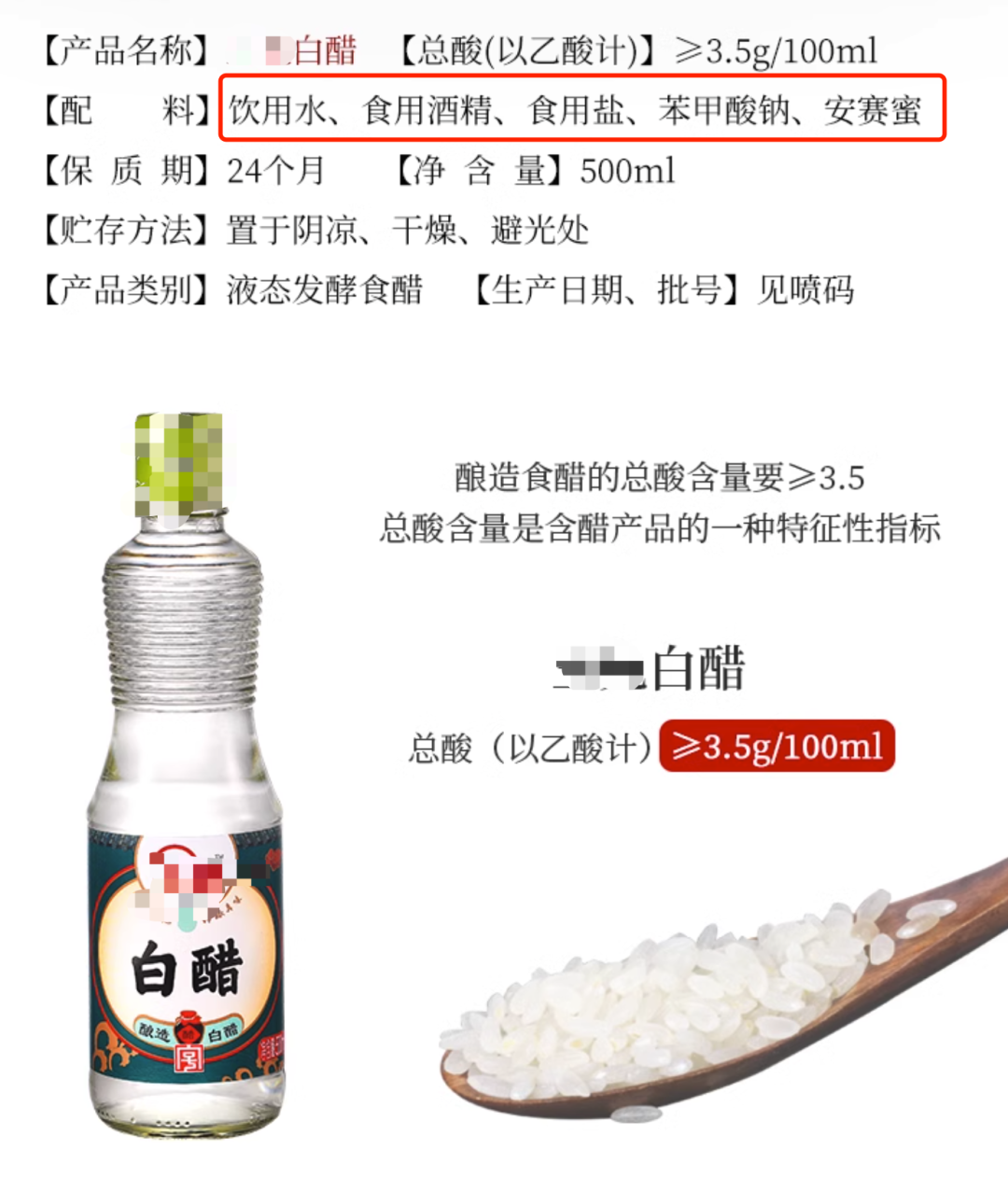 加「食用酒精」是为了酸味,加「安赛蜜」是为了甜味,加「苯甲酸钠」是为了防腐,这样的白醋在天猫旗舰店售价竟然高达 9.9 元(500ml装)。