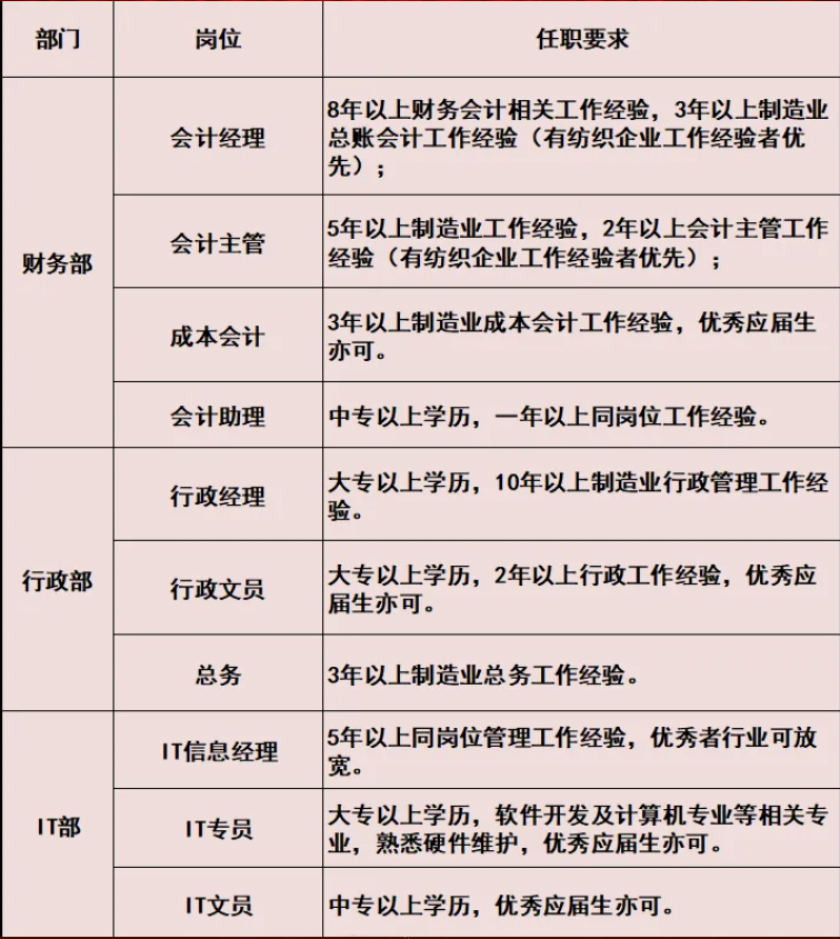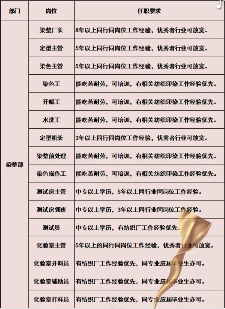 要求:纺织染整相关专业出身,有染厂工作经验优先