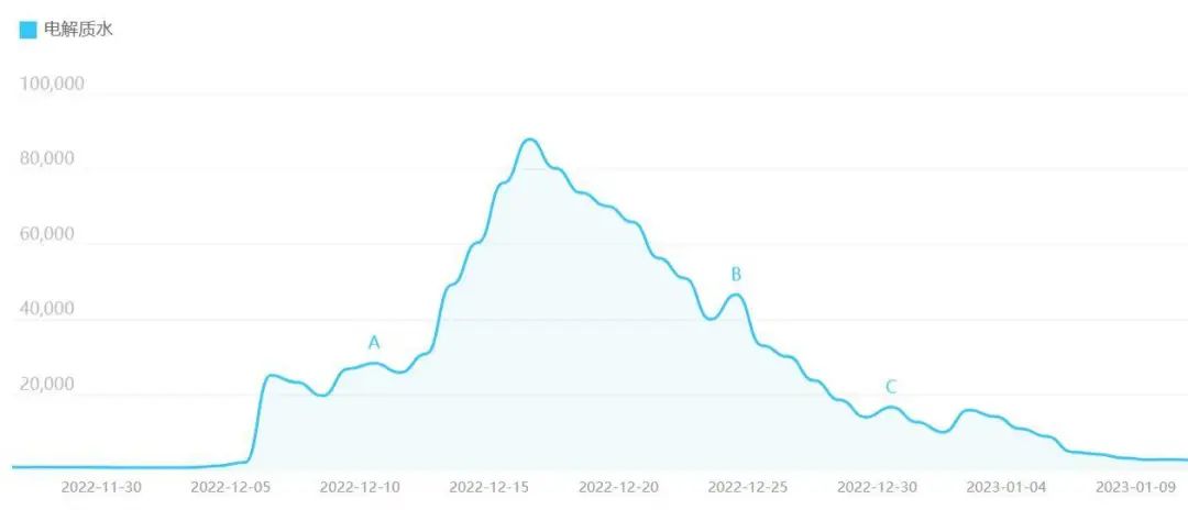 这就出现了电解质水遭到疯抢。百度指数显示,2022年12月4日,“电解质水”这一关键词的搜索量较前一日增长12倍多,到12月16日达到顶峰。