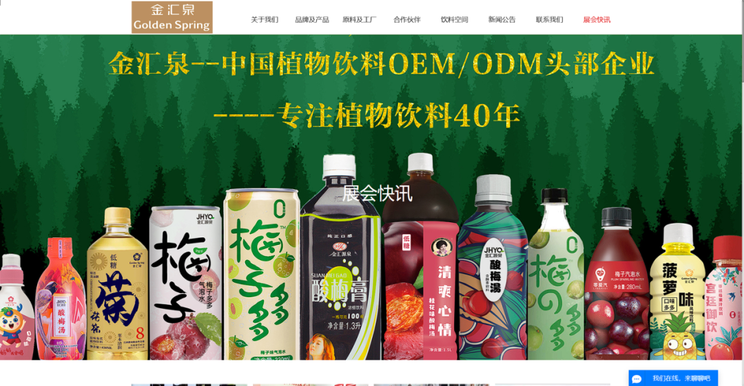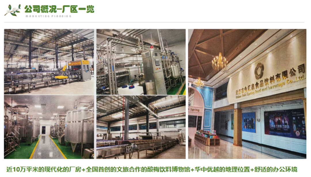 武汉市金汇泉食品饮料有限公司(简称金汇泉食品、金汇泉)成立于 2003 年,是一家从事直饮酸梅汤、浓缩酸梅膏、浓缩果汁、植物饮料及风味气泡水等食品饮料研发、生产及销售为一体的高新技术企业。现已建成投资 1.5亿元,占地面积约 2.5 万平方米,新增生产线 7 条,年产值达 30 亿元的现代工业园区,并已打造成为全国首家酸梅类的文创参观型工厂。