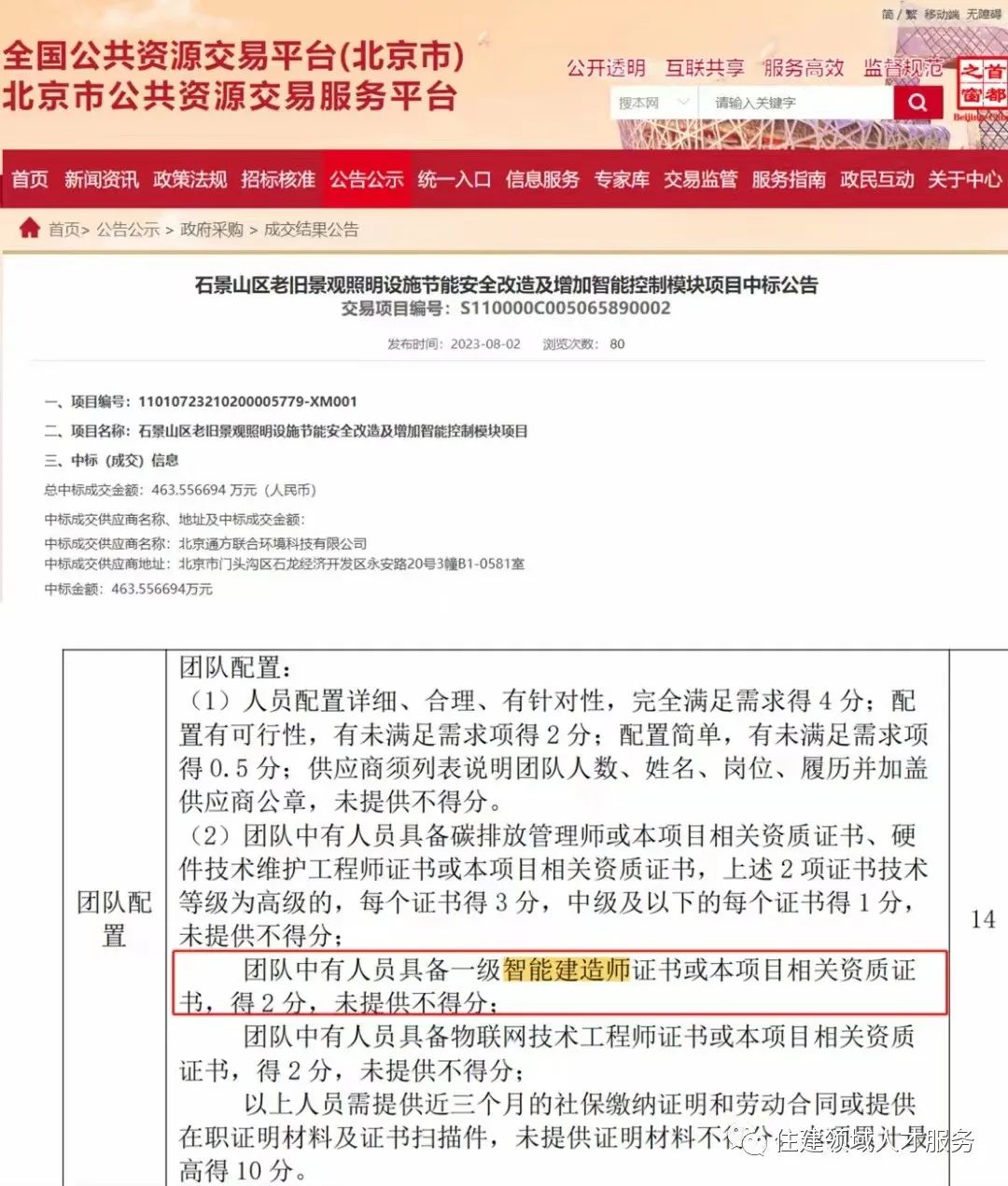 2023年8月2日,北京市公共资源交易服务平台发布石景山区老旧景观照明设施节能安全改造及增加智能控制模块项目中标公告,公告文件评分表中写明:团队中有人员具备一级智能建造师证书或本项目相关资质证书,得 2 分,未提供不得分。