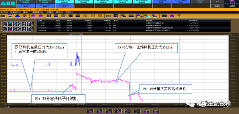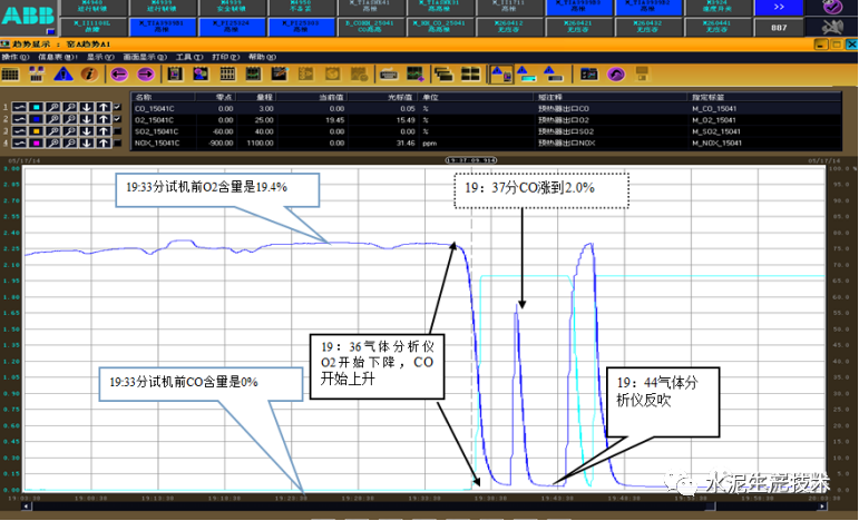 1、窑头转子秤发生过载跳停后,因转子秤气动闸板阀关闭不严,现场调整转子秤间隙和正反转开秤时,导致19:33分至19:46分大量煤粉持续喷入窑内(约3.5吨煤粉),导致系统产生过量CO气体,CO浓度达到2.0%以上(气体分析仪满量程),窑尾电收尘联锁跳停;2、窑头喂煤秤空载时送煤罗茨风机压力为15Kpa左右,窑满负荷生产时,窑头喂煤量为12t/h左右,送煤罗茨风机压力为26Kpa左右,在窑头秤处理故障时窑头送煤罗茨风机压力持续为35Kpa左右,实际喂煤量高达18t/h左右,中控没有准确判断,也没有采取果断措施停止喂煤罗茨风机,导致煤粉大量喷入窑内;3、由于大量煤粉喷入窑内产生不完全燃烧,已发现窑尾烟囱持续在冒黑烟,19:44分中控显示CO含量从2.0%降低至0.06%时,实际此时气体分析仪正在周期性反吹,CO浓度仍然持续在2.0%以上,中控没有结合操作参数变化和现场情况,误判断为系统CO含量正常,19:45中控对窑尾电收尘进行荷电,19:46分窑尾电收尘发生爆炸事故。