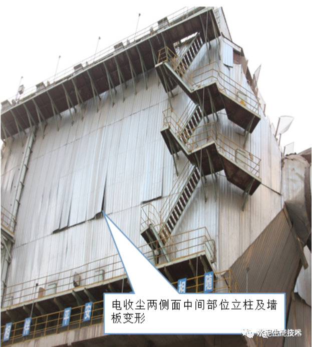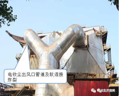 5月17日18:42分,XX水泥1#窑窑头转子秤无应答跳停,中控复位后仍无法启动,中控操作员联系电气人员进行检查处理并汇报相关领导,18:50分止料停窑处理。现场电气人员检查窑头转子秤为过载跳停,复位后联系中控开机,中控开启窑头转子秤又过载跳停,切换到现场进行反转处理,正反转均过载跳停,随即机修人员进行转子秤间隙调整,调整后19:33分现场开启窑头转子秤,开启瞬间发生“冲煤”现象,中控窑头喂煤量最高显示19.98t/h。19:36分窑尾电收尘因CO高高报联锁跳停(CO含量大于0.8%窑尾电收尘联锁跳停),预热器出口气体分析仪CO瞬间涨至满量程2.0%。为控制预热器出口温度,止料时1506挡板全关,19:27分1506高温风机停机,出口负压控制着-300Pa左右,1618风机挡板开度在25%。19:44分中控调整1506挡板开度为50%,中控显示CO含量从2.0%降低至0.06%时(实际此时气体分析仪正在周期性反吹),19:45中控对窑尾电收尘进行荷电,19:46分窑尾电收尘发生爆炸事故。XX水泥公司领导立即对爆炸现场进行检查,并汇报区域、股份公司领导及相关部室。经检查,现场无人员伤亡,主要是窑尾电收尘进出风口风管及软连节炸裂、进风口及部分分布板脱落变形、出风口电收尘第五电场极板变形、电收尘侧墙部分立柱变形。