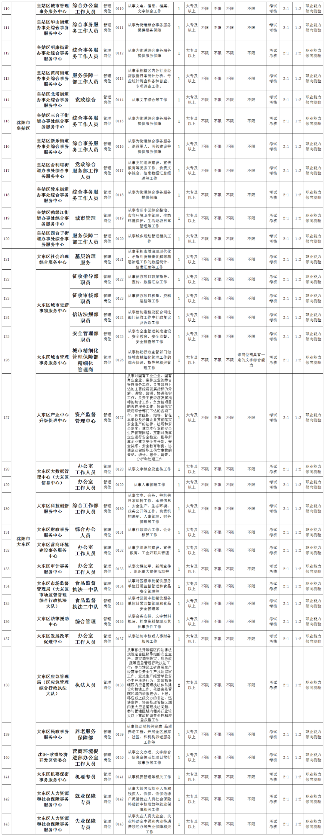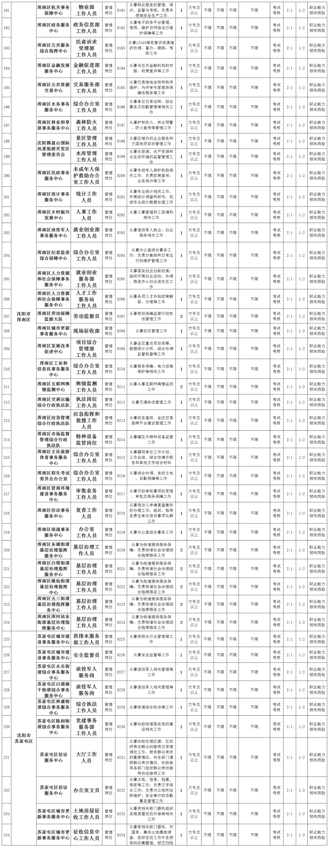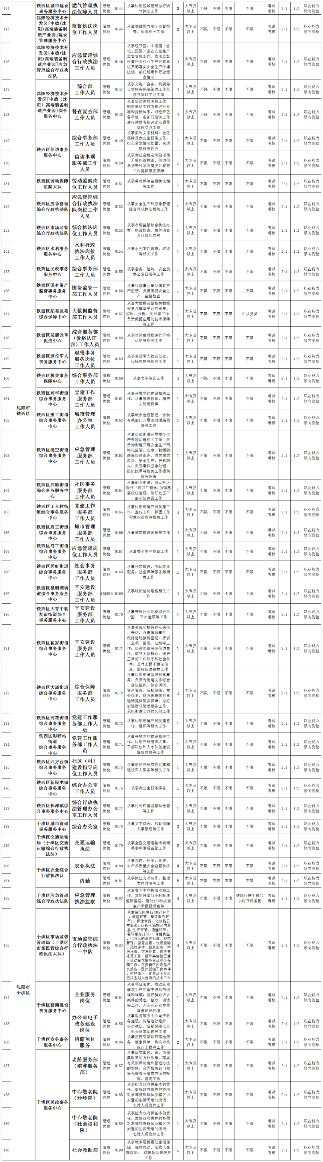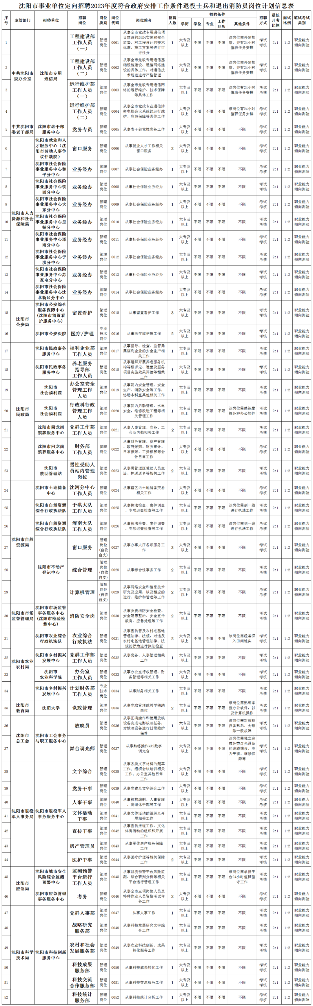 根据《事业单位人事管理条例》(国务院令第652号)、《中共辽宁省委组织部、辽宁省人事厅关于印发<辽宁省事业单位公开招聘人员办法>的通知》(辽人发〔2007〕1号)、《退役士兵安置条例》等规定,决定面向2023年度符合政府安排工作条件退役士兵和退出消防员开展定向招聘。现将有关事项公告如下:沈阳市接收的2023年度符合政府安排工作条件退役士兵和退出消防员。应聘人员年龄原则上不超过35周岁(1987年8月21日及以后出生)。在部队服役期间立功受奖者年龄可适当放宽至38周岁(1984年8月21日及以后出生)。在部队服役期间立功受奖情况,以档案中《安排工作退役军士和义务兵服现役表现量化评分表》奖励及表彰栏内记载认定的项目为准。1.招聘岗位具体资格条件,详见《沈阳市事业单位定向招聘2023年度符合政府安排工作条件退役士兵和退出消防员岗位计划信息表》(附件)(见文中最下方)。2.招聘岗位要求的学历是指国家承认的学历。应聘人员应于2023年8月21日前获得相应的学历。2.曾因犯罪受过刑事处罚的;有犯罪嫌疑尚未查清或正在接受纪律审查的;4.按照《事业单位人事管理回避规定》(人社部规〔2019〕1号)应当回避的;通过沈阳市人力资源和社会保障局、沈阳市退役军人事务局、沈阳市考试院官方网站发布招聘公告。http://rsj.shenyang.gov.cnhttp://tyjrswj.shenyang.gov.cn本次招聘采取网络报名的方式进行,不设现场报名,每名应聘人员只能报考一个岗位。请按以下程序进行:1.报名时间。2023年8月21日9时至17时。应聘人员登录沈阳市考试院官方网站填写报名信息,并上传照片(本人近期免冠2寸正面证件电子照片,jpg格式,大小30KB以下)。2.查询审查结果。审查通过的,不可再报考其他岗位;未通过的,在报名时间内可改报其他岗位。资格审查贯穿招聘全过程,一经发现应聘人员不符合报考岗位要求或弄虚作假的,随时取消应聘人员考试和应聘资格。3.网上打印准考证。审查通过的人员,于2023年8月25日10时至2023年8月29日9时。登录沈阳市考试院官方网站自行打印准考证、报名登记表(A4纸,各一式两份,黑白、彩色均可),并妥善保管,以备笔试、现场资格审查、面试环节使用。4.岗位调剂与削减。招聘岗位有效报名人数与招聘计划达不到2:1时,将取消或削减该岗位招聘计划。报考已取消岗位的应聘人员,可以在2023年8月22日10时至11时30分内报考其他未被取消的岗位。未按规定时间改报的,视为放弃报考。笔试时间:2023年8月29日(星期二),上午09:00—10:30。笔试全部为客观性试题,考试科目为职业能力倾向测验,包括言语理解与表达、常识判断、数量关系、判断推理和资料分析等。同时,依据档案中《安排工作退役军士和义务兵服现役表现量化评分表》确认分数,以10%比例计入笔试成绩,笔试成绩保留两位小数。应聘人员按照准考证上确定的时间和地点,携带笔试准考证、本人身份证参加考试。笔试成绩在沈阳市考试院官方网站进行查询。具体时间请关注沈阳市考试院官方网站成绩查询入口。笔试阅卷结束后,沈阳市人力资源和社会保障局会同沈阳市退役军人事务局确定笔试最低合格分数线。未达到最低合格分数线者不得参加现场资格审查和面试。现场资格审查时间及相关事宜通过沈阳市退役军人事务局官方网站对外发布。依据招聘公告、岗位资格条件等,按照招聘岗位笔试成绩从高到低的顺序,对报名资格进行审查确认。主要审查考生身份证、学历学位证书。未在规定时间接受资格审查的应聘人员视为自动放弃。因提供证件、信息等与招聘岗位要求条件不符而取消面试资格的,应聘人员自负后果,由此产生的岗位空缺由报考该岗位人员依次递补。面试公告及参加面试人员名单通过沈阳市退役军人事务局官方网站公布。面试满分为100分,合格分数线为60分,未达到合格分数线的,不能聘用。面试采取结构化面试形式。应聘人员通过现场资格审查后,按照招聘计划数与面试人数1:2的比例,依照笔试成绩从高到低的顺序,确定各岗位参加面试人员名单。最后一名进入面试人员的笔试成绩并列者,同时进入面试,未达到规定的面试比例的,按实际人数确定面试人选。面试前,因应聘人员自愿放弃或弄虚作假被取消面试资格及其他原因出现岗位空缺的,将进行递补。面试开始后,不再进行递补。总成绩=笔试成绩×40%(成绩保留到小数点后2位,第3位不实行四舍五入)+面试成绩×60%(成绩保留到小数点后2位,第3位不实行四舍五入)体检人员名单通过沈阳市退役军人事务局官方网站公布。根据应聘人员的总成绩从高到低的顺序,按招聘计划1:1的比例确定参加体检人员。总成绩并列者,面试成绩高者确定为参加体检人员。如面试成绩也并列,采取面试加试的方式确定参加体检人员。体检工作参照《关于修订<公务员录用体检通用标准(试行)>及<公务员录用体检操作手册(试行)>的通知》(人社部发〔2016〕140号)、《关于切实做好维护乙肝表面抗原携带者入学和就业权利工作有关问题的通知》(人社厅发〔2010〕22号)和《关于进一步做好公务员考试录用体检工作的通知》(人社部发〔2012〕65号)等有关规定组织实施。对身体有特殊要求的招聘岗位,参照《关于印发公务员录用体检特殊标准(试行)的通知》(人社部发〔2010〕82号)执行。体检统一组织在具有公务员考录和事业单位公开招聘体检经验的三级甲等