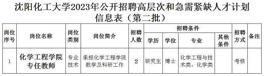根据《事业单位人事管理条例》(国务院令第652号)、《中共辽宁省委组织部、辽宁省人事厅关于印发<辽宁省事业单位公开招聘人员办法>的通知》(辽人发〔2007〕1号)、《中共辽宁省委组织部、辽宁省人社厅转发中组部、人社部<关于进一步规范事业单位公开招聘工作的通知>》(辽人社发〔2011〕9号)和《辽宁省人民政府办公厅转发省人力资源社会保障厅关于调整政府机关公务员和省政府所属事业单位人事管理权限的通知》(辽政办发〔2017〕61号)等规定,结合我单位实际,拟面向社会公开招聘工作人员。现将有关事项公告如下:符合报考基本条件和招聘岗位具体资格条件的2023年应届毕业生及社会在职、非在职人员。(四)具备岗位所需的专业或技能条件,适应岗位要求的身体条件;(五)岗位所需要的其他条件,详见《沈阳化工大学2023年公开招聘高层次和急需紧缺人才计划信息表(第二批)》(见文中最下方)。曾因犯罪受过各类刑事处罚,有犯罪嫌疑尚未查清或正在接受纪律审查的,国家法律法规规定不得聘用的其他人员,均不得报考。应聘要求具有博士学位或副高级以上专业技术职务岗位的人员,原则上不超过45周岁(1977年8月21日及以后出生)。应聘者的资格条件或相关资历的计算日期为报名起始之日。海外院校毕业生取得的学历学位证书应获得国家教育部认证。2023年普通高校应届毕业生可先行报名及考核,经考核、体检、考察、公示并于2023年12月31日之前取得毕业证书、学位证书的,可按规定聘用,否则不予聘用。自公告发布之日起三个工作日后至2023年12月31日止。报名方式:网上报名。符合我单位招聘条件的应聘者请将个人简历发送至rczp@syuct.edu.cn进行报名,网上报名中应明确填写申报岗位代码和岗位名称,且每人限报一个岗位。邮件主题:岗位序号+岗位名称+应聘者姓名。报名实行诚信承诺制度,报名者填报的信息应真实有效,如发现材料虚假者随时取消其应聘资格。我单位将严格按照公告及岗位资格条件,对考生报名资格进行审查确认。主要审查报名者提供的身份证、学历学位证书、专业技术职务资格证书以及招聘信息中所涉及的资历和其他条件要求的证明材料。资格审查贯穿招聘全过程,一经发现考生不符合报考岗位要求或弄虚作假的,随时取消考生应聘资格。由学校人事处组织资格审查合格人员参加考核。重点对应聘者思想政治表现、道德品质、业务能力、工作实绩等情况进行考核。考核形式为现场考核,考核成绩即为应聘者总成绩。根据应聘人员的总成绩从高到低的顺序,按招聘计划1:1的比例确定参加体检人员。体检人员名单在我单位网站体检工作参照《关于修订<公务员录用体检通用标准(试行)>及<公务员录用体检操作手册(试行)>的通知》(人社部发〔2016〕140号)、《关于切实做好维护乙肝表面抗原携带者入学和就业权利工作有关问题的通知》(人社厅发〔2010〕22号)和《关于进一步做好公务员考试录用体检工作的通知》(人社部发〔2012〕65号)等规定组织实施。对身体有特殊要求的招聘岗位,参照《关于印发公务员录用体检特殊标准(试行)的通知》(人社部发〔2010〕82号)执行。 体检由我单位统一组织在具有公务员考录和事业单位公开招聘体检经验的三级甲等医院进行。应聘者对体检结论有疑问要求复检的,可在接到体检结论的7日内,以书面形式向我单位提出。另有规定的,从其规定。复检将在应聘者提出申请的7个工作日内安排。复检内容为对体检结论有影响的项目,复检只能进行一次,体检结果以复检结论为准。体检合格者确定为拟考察人员。由主管部门会同我单位对拟考察人员的思想政治表现、道德品质、业务能力、工作实绩等情况进行实地调查了解,并对被考察人员资格条件进行复查。考察中发现不符合聘用条件的,取消其聘用资格,并将结论及依据明确告知被考察人员。考察合格者,确定为拟聘用人员。(www.syuct.edu.cn)进行公示,公示期为7个工作日。公示结束后,对公示无疑义人员办理备案手续,相应的招聘计划予以核销。对于公示有疑义的人员,我单位将调查核实,并提出处理意见。公开招聘的人员按规定实行试用期制度。试用期一般不超过6个月(初次就业签订3年以上聘用合同的,试用期为12个月),国家另有规定的按规定执行。试用期包括在聘用合同期限内。试用期满合格的,予以正式聘用;不合格的,取消聘用。公开招聘工作坚持“公开、平等、竞争、择优”的原则,严肃纪律,秉公办事,严禁弄虚作假,徇私舞弊,全程接受纪检监察部门和社会的监督。报考者有弄虚作假、违纪违规行为的,一经发现,均取消其应聘资格,并将有关情况通报其所在学校或单位。构成犯罪的,依法追究刑事责任。1.本次招聘不指定辅导书,不举办也不委托任何机构举办考试辅导培训班。目前社会上出现的任何辅导班、辅导网站或发行的出版物、上网卡等,均与本次招聘无关。敬请广大报考者提高警惕,切勿上当受骗。2.应聘者自报名至拟聘用人员公示(资格审查、考核、体检、考察)期间,应确保报名时所填报的通讯工具畅通,以便我单位联络,因所留通讯方式不畅所致后果,由应聘者自负。3.在招聘期间,如不按本公告完成规定招聘步骤(程序)的,视为自动弃权。4.在体检和考察环节,因体检不合格、考察不合格、自愿弃权、弄虚作假被取消应聘资格及其他原因出现