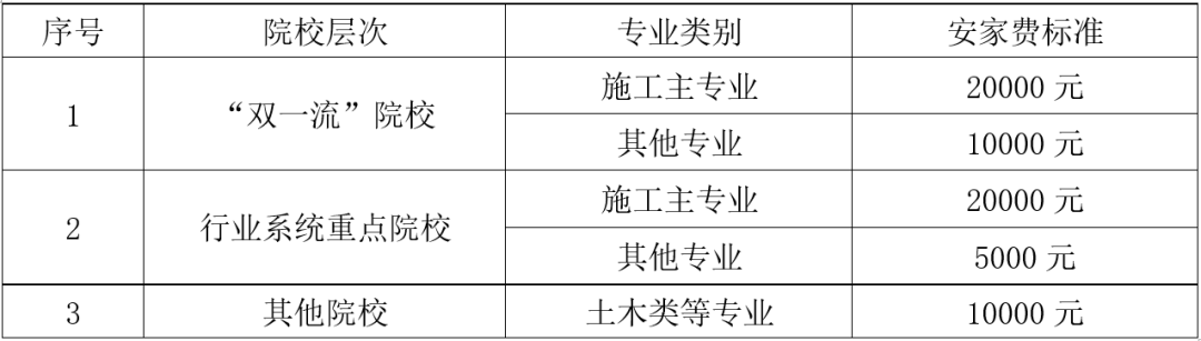 对新入职的“双一流”院校施工主专业本科及以上毕业生,每月给予 1000 元津贴,其他专业每月给予 500 元津贴,津贴支付期限为三年。