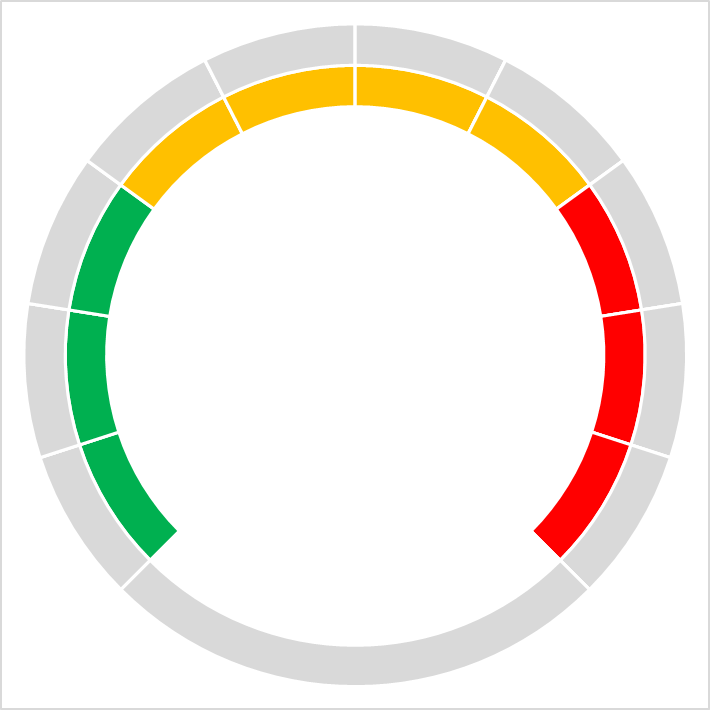 插入圆环图后我们需要来更改下图表中的颜色,这个时候我们需要双击图表中的一节一节的圆环来一个一个的为其设置颜色,大家可以将最外部的圆环设置为灰色,将里面的圆环按照绿黄红三个颜色设置即可,有一个小技巧介绍给大家,当为一段设置颜色后可以按f4快速设置颜色,设置为如下图的颜色即可,然后我们将这个图形的宽与高都设置为12即可随后我们为这个数据区域添加数据标签,我们选择内侧的圆环为这个数据区域添加数据标签,然后点击标签按Ctrl+1调出格式窗口勾选单元格中的值,然后将值和引导线去掉即可,这样的话数据标签是在图表上的所以我们需要双击标签来一个一个的调整我们复制指针数据然后将其粘贴到图表中这样的话就得到了三个圆环图然后点击更改图表类型将系列三设置为饼图,并且将第一扇形起始角度设置为225度,将这个饼图的形状轮廓设置为红色并且将粗细设置为5磅