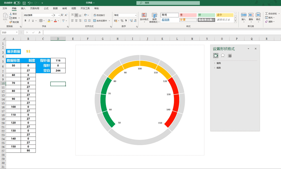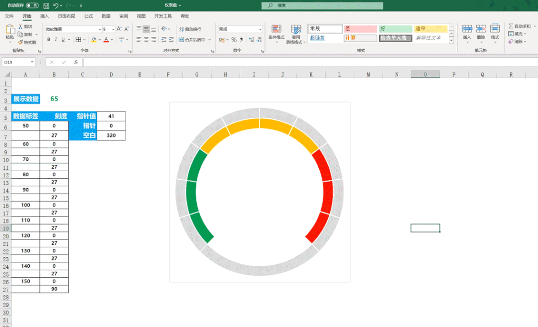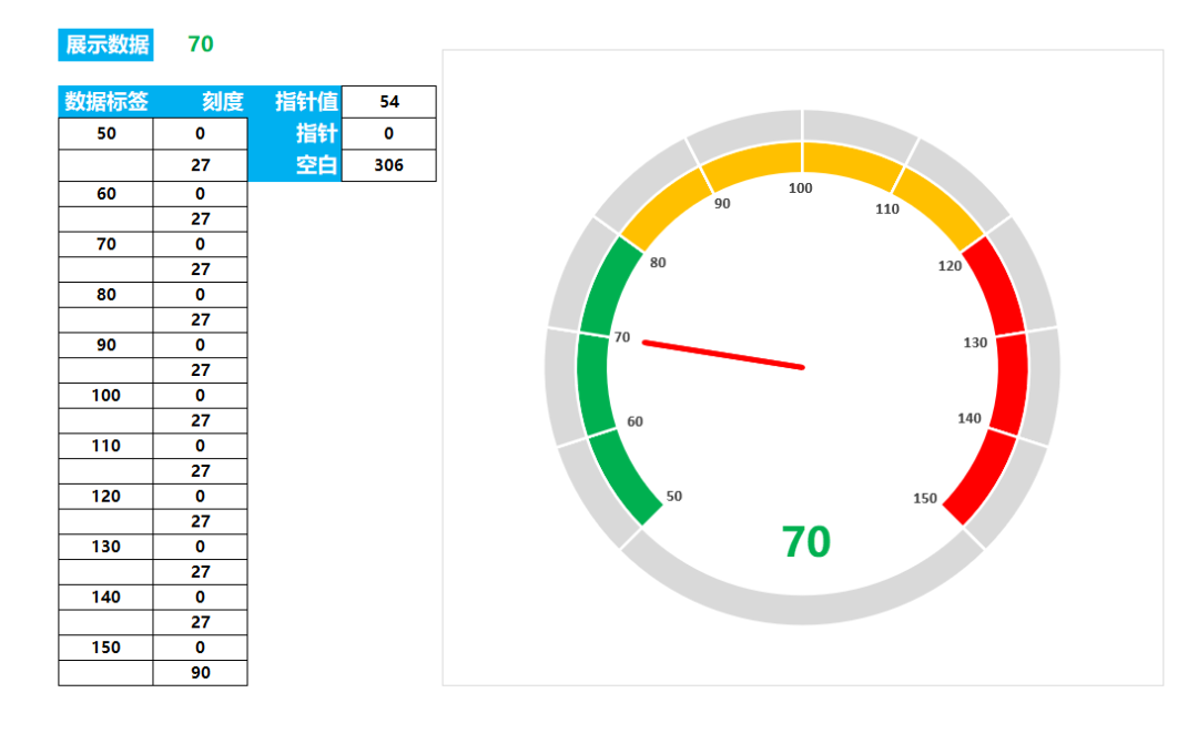 刻度:刻度值是0与27为一组成对出现的,因为着色的区域是270度,而我们将这个区域等分为了10份,所以每一份就是27,而这个0就对应的仪表中的刻度,在这里需要注意的是最后一个值需要设置为90数据标签:在这里数据标签是与刻度一一对应的,数据标签对应的是刻度中0这个值,大家可以根据自己的需求来设置数据标签,只需要将数据等分即可指针值:270/100*(C3-50),在这里我们设置的数据是从50开始到150结束,在270度的这个扇形区域中一共有100个值,所以我们用270除以100就得到每一个数据值多少度,然后让这个结果乘以c3减去50,因为在这指针是从50开始的,所以我们需要用展示数据减去50空白:360-D5-D6,就是用360度减去指针值以及指针即可我们选择刻度的数据区域,然后点击插入在饼图中找到圆环图,插入圆环图后按Ctrl+1调出设置窗口将第一扇形起始角度设置为225度,随后我们再将刻度这个数据复制一份,然后点击鼠标按Ctrl+v粘贴,这样的话我们就插入了2个圆环图