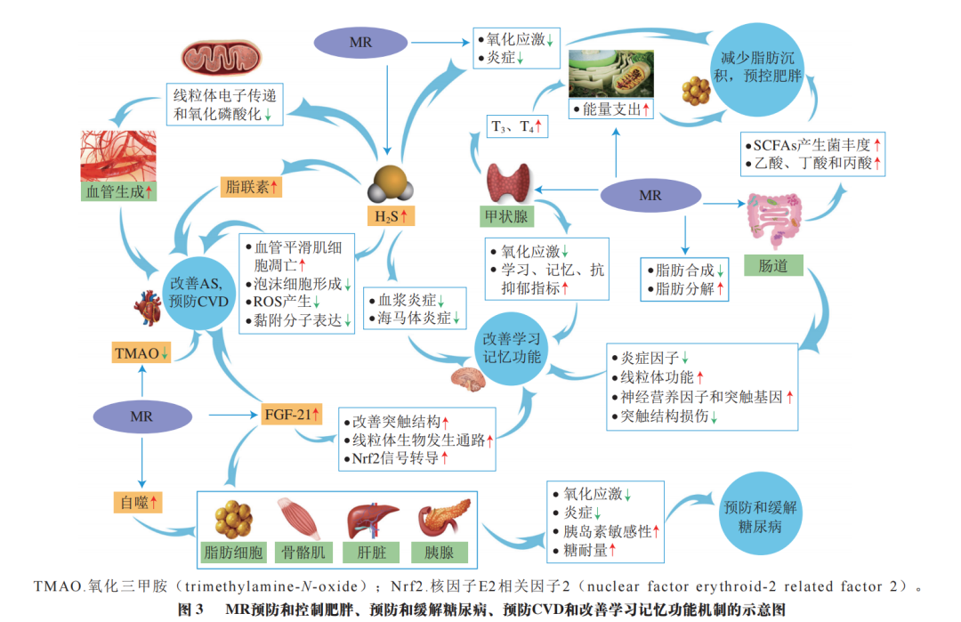 1993年,首次发现将饮食中Met的含量从0.86%降低到0.17%可使雄性Fischer 344大鼠的寿命延长30%。随后,MR先后被证明可以延长酵母、线虫、果蝇、啮齿类动物及人类细胞的寿命。目前报道的其延长寿命的机制主要有以下3 种(图2)。1)活性氧(ROS)过度产生导致的氧化损伤、炎症和代谢稳态的丧失均能够加速衰老,缩短寿命。MR能够减少ROS产生,减少自由基泄漏并清除自由基,减少机体氧化应激引起的氧化损伤和炎症。2)MR延长寿命的作用还与雷帕霉素靶蛋白(TOR)信号的抑制有关。反馈信号的激活可以延长酵母细胞的寿命,而TOR信号可以抑制反馈反应,因此,抑制TOR信号能够延长寿命。3)MR能够激活自噬通路。MR能够上调自噬相关基因的表达,增加细胞内错误折叠、失去功能的大分子蛋白质以及受损和衰老的细胞器的降解和回收,以满足细胞的代谢需求和细胞器的更新,维持和改善正常的细胞功能。综上所述,MR具有延缓衰老和延长寿命的生理功能。
