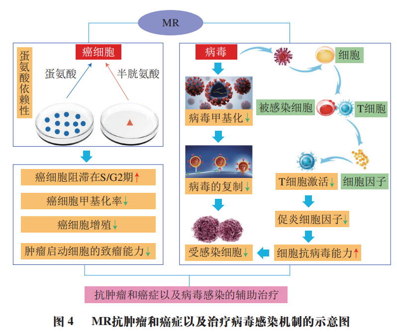 MR不仅能抑制病毒复制,还能抑制感染细胞的增殖。其机理在于MR对病毒甲基化的影响,由于病毒具有RNA帽结构,病毒的复制依赖于RNA帽的甲基化,SAM是甲基供体,而SAM的浓度取决于宿主机体中Met的水平,这对MR应用于抗病毒和病毒感染的辅助治疗具有极其重要的意义。自疫情开始以来,一系列研究随即展开。研究表明,大多数新冠肺炎患者均伴有细胞因子风暴,表现为血清促炎细胞因子水平显著升高。这是由SARS-CoV-2诱导的T细胞和巨噬细胞过度激活引起的。T细胞被激活后对Met的需求增加,更重要的是,T细胞吸收利用的主要是外源Met。MR能显著减少外源Met的摄入,有助于避免T细胞的过度激活,切断巨噬细胞和活化的T细胞之间的正反馈回路,阻止或缓解细胞因子风暴,避免持续的炎症和损伤,减轻患者的疾病症状。图4展示了MR抗病毒和治疗病毒感染的机制。