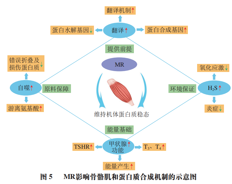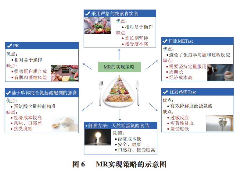 有研究报道高Met饮食会对骨骼肌造成损伤,引起骨骼肌血管周围严重纤维化,而MR能够抑制HFD引起的骨骼肌形态结构的变化和骨骼肌蛋白的降解,提高骨骼肌指数,也不会降低血浆总蛋白和白蛋白水平,其机制主要包括4 个方面(图5):1)上调机体蛋白质合成通路。2)诱导自噬的增加,保障蛋白质合成的原料。3)提高能量代谢。4)提高H2S水平,改善氧化应激和炎症,为蛋白质合成提供了良好的细胞内环境,有利于蛋白质的合成。MR对骨骼发育的影响可能是双向的,基于目前的研究,对于处于生长阶段的未成年生物体来说,MR可能会产生负面的影响;而对于已达到最大生长水平的成年或老年生物体来说,MR可能会产生有益的影响。目前国内外研究报道实现MR的策略主要有5 种,分别是PR饮食、纯素食饮食、单体氨基酸配制饮食、口服METase和注射rMETase。图6直观展现了MR的各种实现策略及其优缺点,并总结了未来实现MR的新思路。