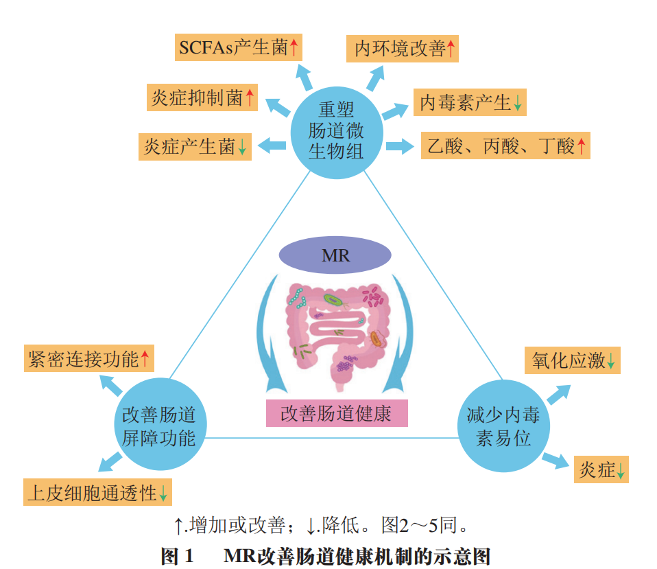 蛋氨酸(Met)又名甲硫氨酸、2-氨基-4-甲硫基丁酸,是人体8 种必需氨基酸中唯一的一种含硫氨基酸。Met是核酸、磷脂、组蛋白、生物胺和蛋白质甲基化的主要甲基供体,启动蛋白质合成并参与氧化还原状态的感知和调节过程,参与S-腺苷蛋氨酸(SAM)、谷胱甘肽合成和多胺代谢,在机体的代谢稳态中具有非常重要的调节作用。基于以上这些Met重要的生理功能,传统的营养学观点认为应增加Met的摄入以保证机体充足的Met供给,许多研究报道了在膳食中添加适量的Met具有促进蛋白质合成。然而,当Met摄入过量时会诱导生长迟缓、血脂异常、高同型半胱氨酸血症(HHcy)、动脉粥样硬化(AS)、学习记忆损伤及骨骼肌损伤等有害机体健康的作用。河南工业大学小麦和玉米深加工国家工程研究中心鲁嫚嫚,钱静,杨玉辉*等就MR研究现状,对MR产生的健康益处及其可能的机制进行较为全面的综述,并探讨实现MR的5 种策略,以期为MR产生健康益处的机制研究提供参考,也为低Met食品的开发应用及MR健康功能的实现提供参考。近年来,国内外大量的研究报道了MR饮食具有许多有益于机体健康的生理功能,这些生理功能主要与代谢综合征、心脑血管疾病、肿瘤和癌症以及年龄相关疾病等相关,几乎涉及了全身所有的器官,调控的相关机制主要包括能量代谢、氧化应激、炎症、自噬、甲基化和短链脂肪酸(SCFAs)等,具体的健康益处及可能的作用机制如下。MR饮食被机体消化系统摄入后,首先在肠道中与肠道微生物接触,使肠道菌群组成及其代谢产物水平发生改变,并影响肠道内环境和肠道健康。研究发现,MR饮食干预能够改善肠道菌群结构,增加有益菌,平衡SCFAs产生菌的昼夜波动,促进对碳水化合物和不易消化膳食纤维的降解和发酵,进而促进肠道中乙酸、丙酸和丁酸的产生。MR能增加炎症抑制菌Oscillospira和Corynebacterium的丰度,降低炎症产生菌Desulfovibrio和Escherichia-Shigella的丰度及其代谢产物脂多糖(内毒素)的水平,改善炎症细胞浸润。此外,MR也能改变紧密连接蛋白的组成和结构,降低紧密连接和上皮细胞的通透性,减少上皮细胞的渗漏,调节肠道紧密连接屏障功能,改善以肠道通透性增加、紧密连接蛋白表达减少为特征的肠道屏障功能障碍,并因此减少内毒素易位,改善肠道的氧化应激和炎症,进而产生改善肠道健康的生理作用(图1)。然而,Met是微生物生长和繁殖所需的重要氨基酸,在MR的生长环境下,肠道微生物是如何进行生长、繁殖和代谢的,特别是增加SCFAs产生菌丰度的具体机理等这些问题仍需进一步深入研究。