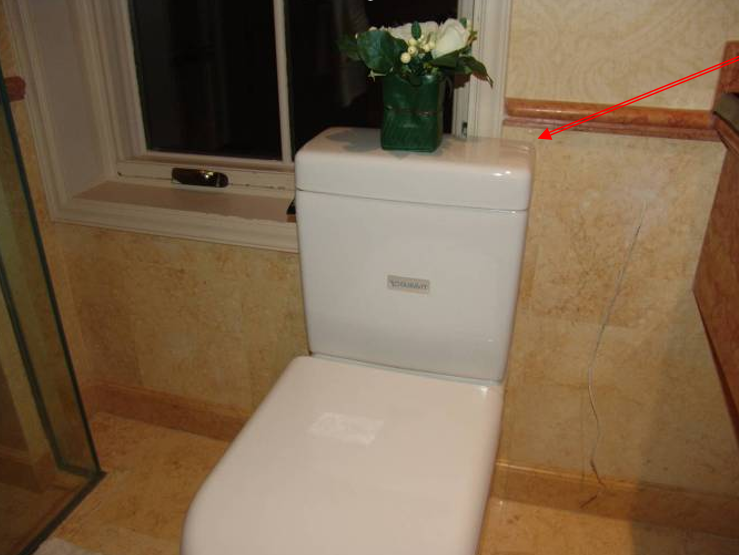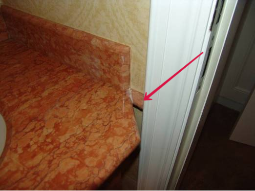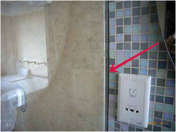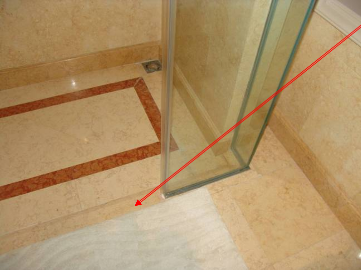 ▲淋浴房玻璃未贴磨砂纸,直接可看到石材侧面,因宽度原因玻璃胶无法盖住