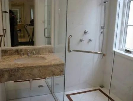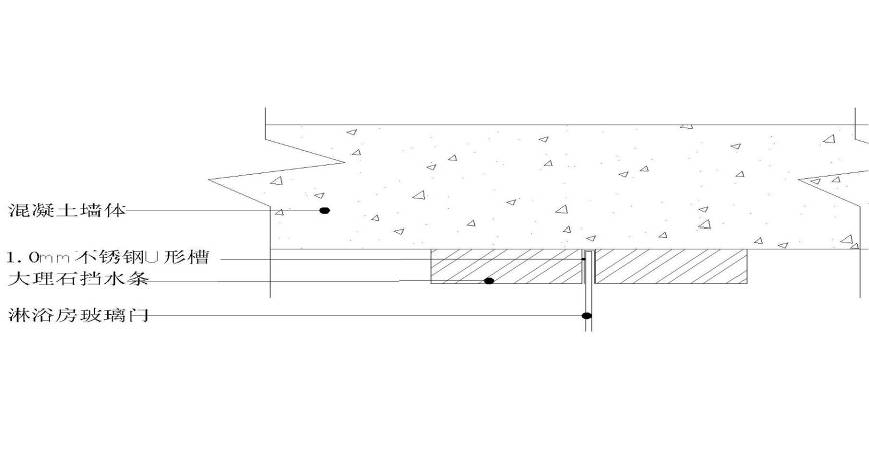 淋浴房玻璃安装前,在两块石材间预埋U形不锈钢槽,把玻璃嵌入槽内,接缝处细打玻璃胶;挡水条石材完成后用12mm夹板钉接U型槽,倒扣罩住挡水条以加以保护。