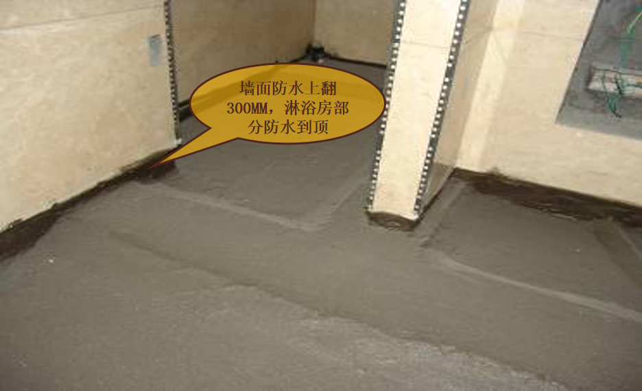 地面采用防水涂料,墙面防水翻边不低于300mm,厚度不小于1.2mm;淋浴房部位墙面采用防水涂料涂刷到顶,不低于吊顶高度。