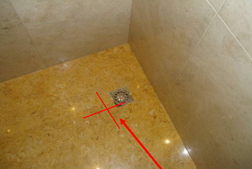▲淋浴房地漏中心点要与地面材料四角重叠