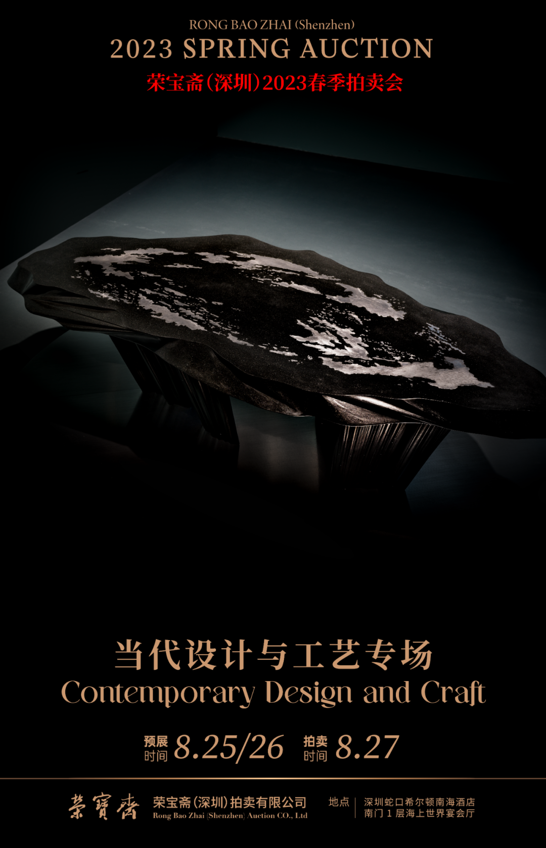 荣宝斋(深圳)拍卖有限公司立足“设计之都”深圳,在首次拍卖中策划了当代设计与工艺专场。既有传统手工艺、非遗传承人的创新,也融合了科技与观念下的当代设计。当代设计与工艺专场以“中的精神”展览出发,呈现当代中国设计师与工艺家们在“中而新、中且新、中又新”上的诸多探索。相信这些兼具文化传承与观念创新的作品,总有一件能成为融入你生活的藏品。