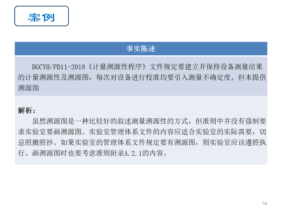 通过不间断的校准链,将测量结果与适当的参考对象相关联,建立并保持测量结果的计量溯源性,说明溯源性是与具体设备、具体参量相关联的,为其提供溯源的机构也有可能不同,因此计量溯源性的描述不能简单的以“实验室设备→××省计量院→国家计量院”这种模式表述,而是应针对不同设备、不同参量描述,必要时还应包括不确定度的要求。