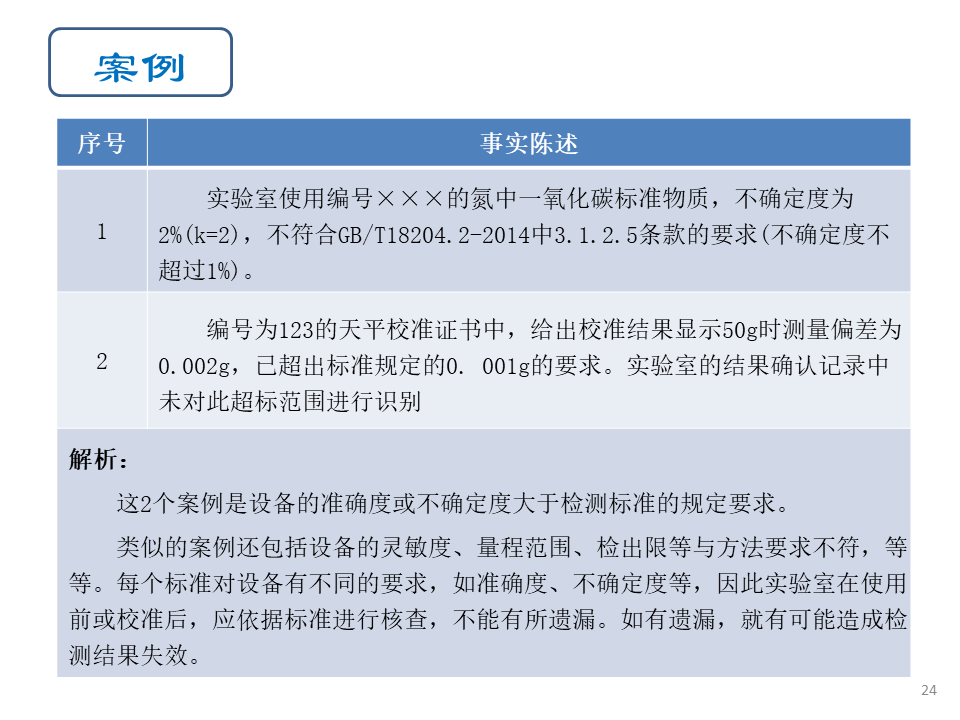 6.4设备条款是现场评审发现问题最多的条款,问题比较集中的是设备验证(校准)以及校准及校准结果确认(6.4.4和6.4.6)、校准方案(6.4.7)、设备期间核查(6.4.10)等内容,以下的案例分析主要涉及6.4.1、6.4.4、6.4.5、6.4.6、6.4.7、6.4.8、6.4.10、6.4.11和6.4.13条款。