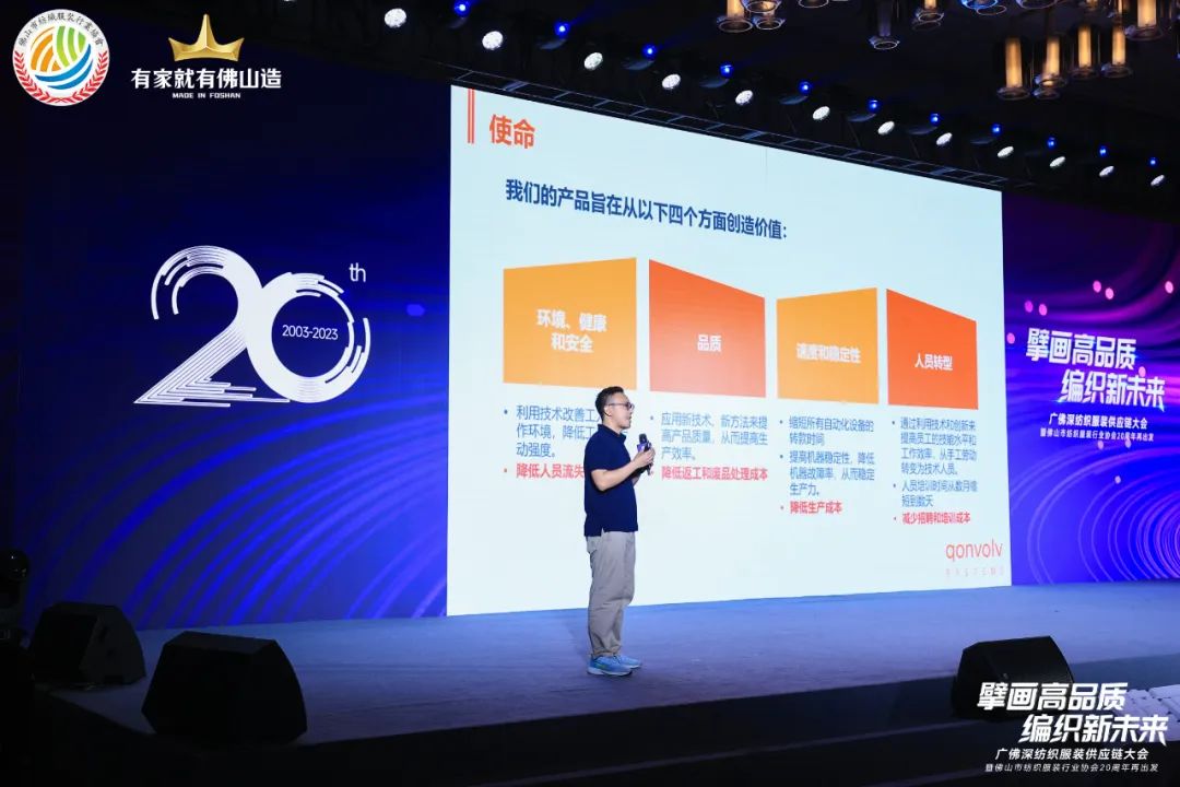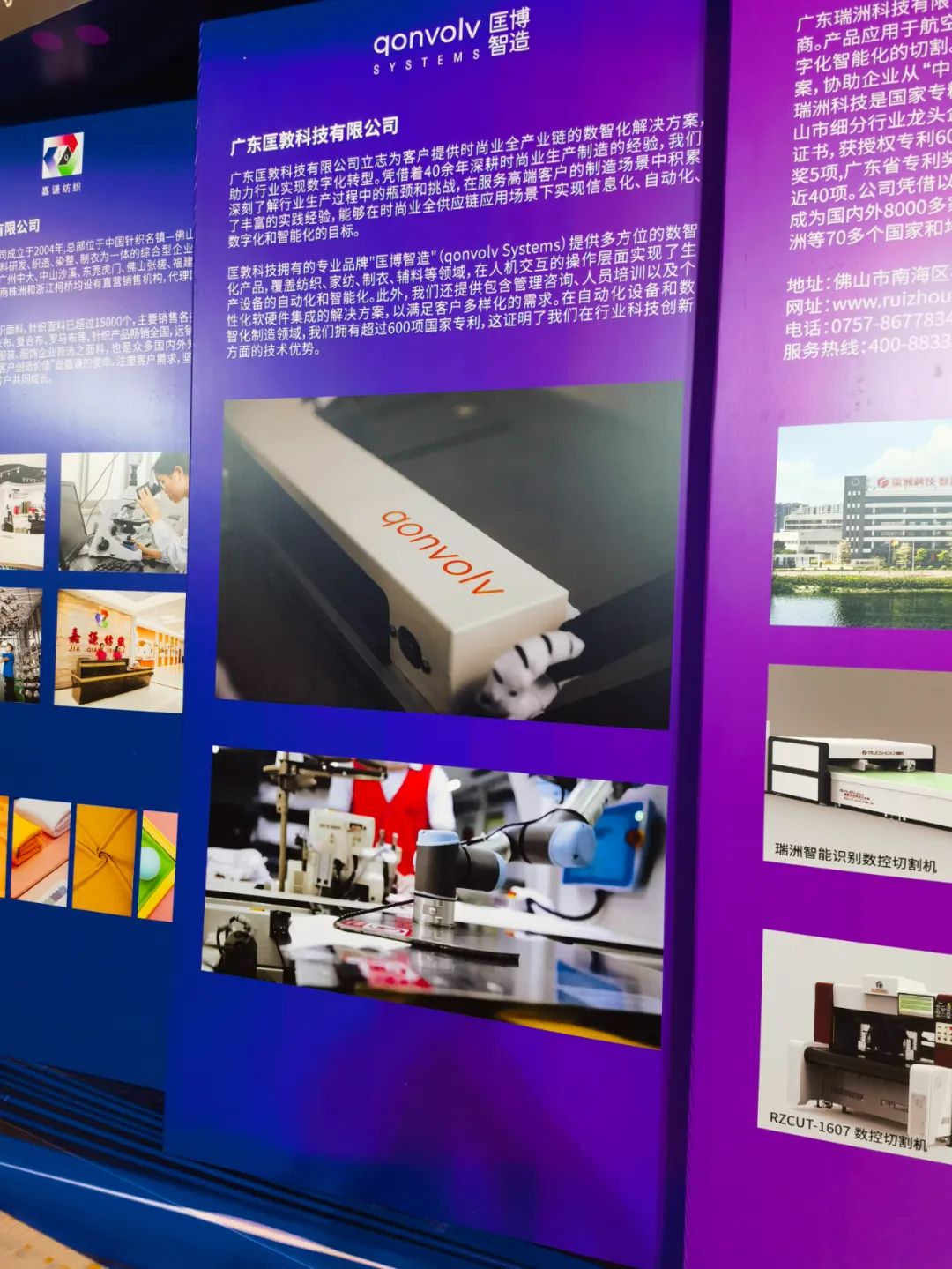 据悉,当天是佛山市纺织服装行业协会成立20周年的日子,协会于 2003 年成立,会员企业涵盖棉纺、织造、印染、色织、纺织、 丝绸、服装、化纤、纺机等纺织产业各个领域。会场现场展示了协会20载的发展历史,以及广佛深三地优秀纺织服装企业的风采,广东匡敦科技有限公司作为纺织服装行业的智能制造实力担当,有幸亮相其中。