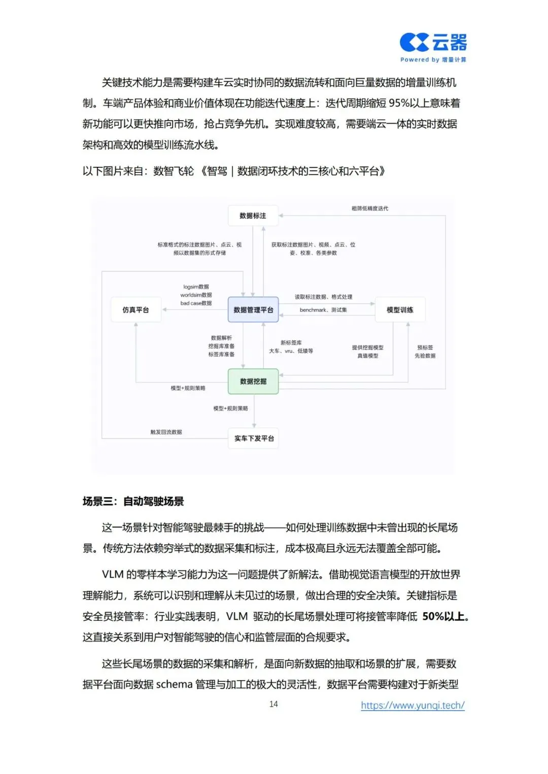 根据麦肯锡全球研究院的预测,到 2030 年,汽车数据变现市场规模将达到 2500 亿 至 4000 亿美元。这个数字意味着什么?它相当于当前全球汽车零部件市场规模的四 分之一,也意味着数据资产的价值正在逼近甚至超越传统硬件的利润贡献。 与此同时,一辆智能网联汽车正在变成一个智能 AI 交互的终端,变成日常生活中 重要的一个“数据场”。产生着大量的数据,也通过数据与 AI 的赋能更好的出行体验: 每辆车每天产生的数据量高达 1 至 2TB,包括高精度传感器数据、驾驶行为轨迹、座 舱交互记录、车辆健康状态等数十个维度。当一家拥有百万级保有量的车企将这些数 据汇聚起来,其体量将轻松突破 EB 级别,足以与互联网巨头的数据资产比肩。现状令人遗憾的是,绝大多数车企的 IT 基础设施仍然停留在"燃油车时代"——批 处理的数仓、割裂的部门系统、离线的分析报表,全生命周期数据存储成本极高,数 据与智能创新没有方向,AI 团队再构建一套新的隔离的数据平台做半/非结构化数据加 工。这就好比一家企业拥有世界上储量最丰富的金矿,却只配备了一把铁锹和几辆手 推车。 "在 2030 年,决定一家车企市值的或许不再是发动机的马力,而是其驾驭数据的' 算力'。" 云器科技通过近几年与很多先进车企的共同创新与实践,推出《智能网联汽车数 据平台白皮书》。这份白皮书将深入剖析智能网联汽车时代数据基础设施的关键挑战, 梳理汽车行业数据的最佳实践,面向 AI 新场景的趋势判断,提出面向未来的技术架构 范式,并分享云器 Lakehouse 如何帮助领先车企构建面向第二增长曲线的数据底座。 希望抛砖引玉,共同推动汽车“AI 与软件定义时代”的数据基础设施重构和升级迭代。 我们相信:汽车行业,作为最早触碰第三代数据革命的领域,数据基础设施的重 构,不是一道选择题,而是一道生存题。随着汽车产业从传统燃油车向新能源汽车加速转型,汽车的角色已从单一的“出 行工具”演变为承载多元生态能力的“智能终端”。这一变革的核心驱动力在于新能 源、数字化与智能化的深度融合,而汽车网联及相关数据平台作为关键基础设施,正 成为支撑车企商业模式升级的核心引擎。 ○性能优化:通过分析车辆行驶数据,如速度、加速度、油耗等,研发团队可 以了解车辆在不同工况下的性能表现,从而优化发动机调校、悬挂系统等,提升 车辆的整体性能。 ○功能改进:收集用户对车辆功能的使用频率和反馈,如导航系统、娱乐系统 等,为功能改进和新功能开发提供依据,满足用户需求。 ○安全设计:分析事故数据和车辆传感器数据,了解事故发生时车辆的状态和 用户行为,为车辆安全设计提供参考,如改进安全气囊触发机制、优化车身结构 等。 •生产制造 ○质量控制:利用生产线上的传感器数据和车辆运行数据,实时监控生产过程 中的质量状况,及时发现并解决生产中的问题,提高产品质量。 ○供应链优化:通过分析供应链数据和车辆销售数据,优化零部件采购和库存 管理,降低生产成本,提高生产效率。 ○故障预测与维护提醒:通过分析车辆传感器数据和历史故障数据,预测车辆 可能出现的故障,提前向用户发送维护提醒,减少车辆故障对用户的影响。 ○远程诊断与维修指导:利用车辆的远程通信功能,技术人员可以远程获取车 辆故障信息,进行初步诊断,并为用户提供维修指导,提高维修效率。 ○服务资源优化:根据车辆分布和故障情况,合理安排售后服务资源,如维修 站点、零部件库存等,提高售后服务的响应速度和质量。 ○用户画像与精准营销:通过分析用户的基本信息、驾驶习惯、车辆使用情况 等数据,构建用户画像,实现精准营销,为用户提供个性化的营销活动和产品推荐。