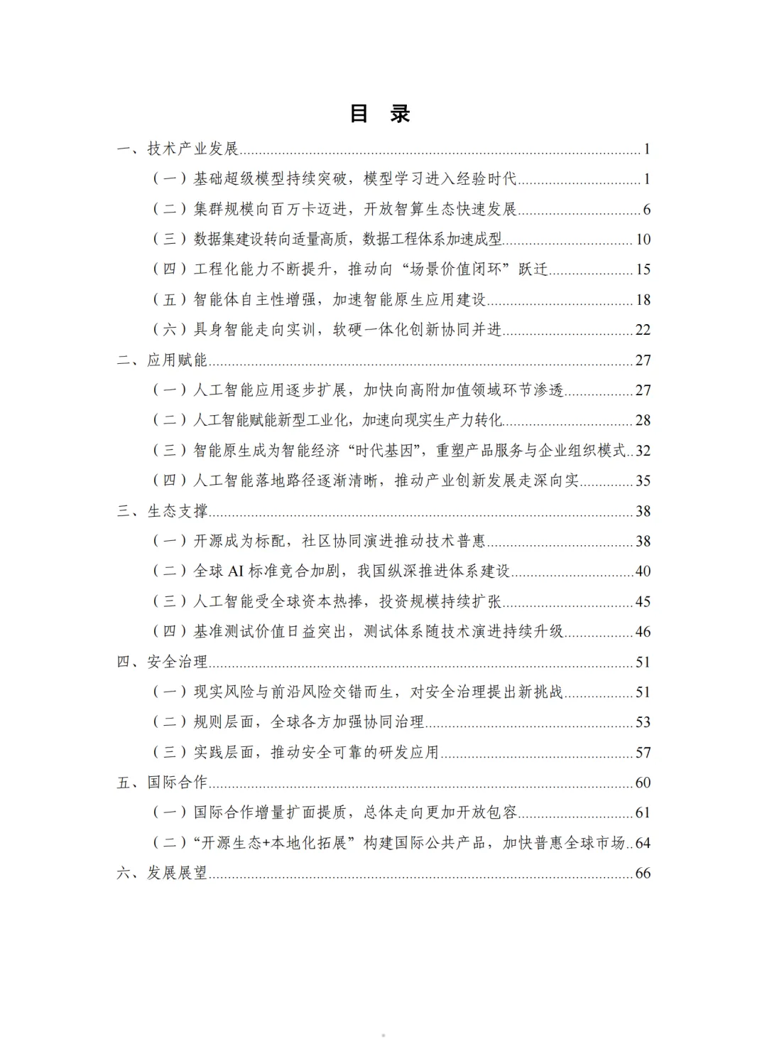 技术层面,大模型将持续优化推理效率、降低幻觉率,世界模型作为"通用世界模拟器"将成为AGI核心路径,具身智能以突破"物理图灵测试"为目标演进;基础设施层面,开源开放智算生态将从局部扩展至软硬全栈,形成自驱生长的飞轮效应;安全治理层面,需构建动态风险识别防护体系,探索体系化主动安全方案,守住物理安全底线;产业形态层面,人工智能将从工具赋能走向系统重构,人机协同、跨界融合、共创分享的智能经济新形态加速形成。