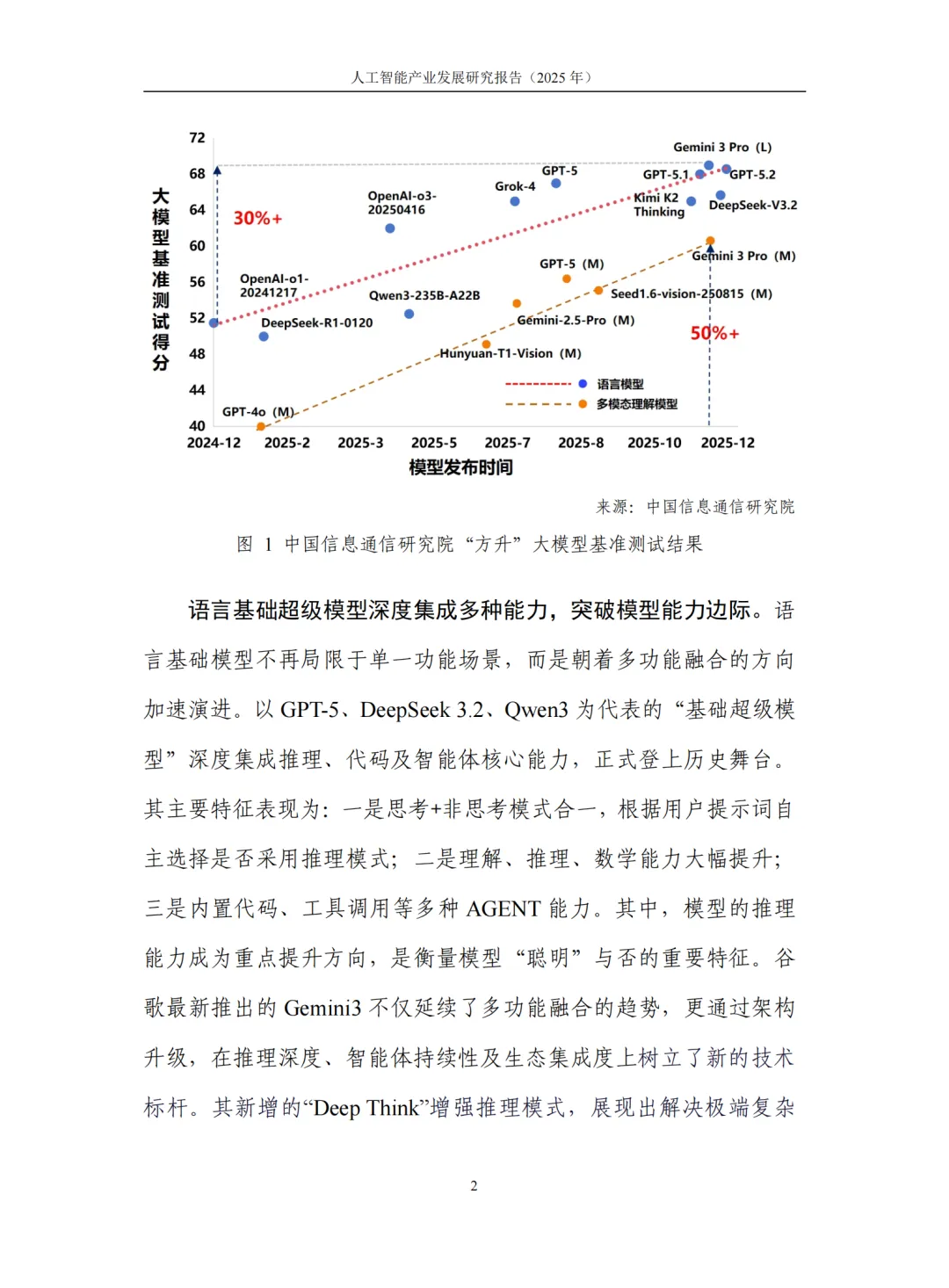 中国信通院"方升"大模型基准测试数据显示,截至2025年12月,以GPT-5.2、Gemini 3 Pro、DeepSeek V3.2、Claude 4.5、Qwen3等为代表的头部语言大模型,综合能力较2024年底提升约30%,多模态理解能力增长超过50%。更关键的是,这种提升并非简单的规模堆砌,而是源于训练范式的根本性转变。