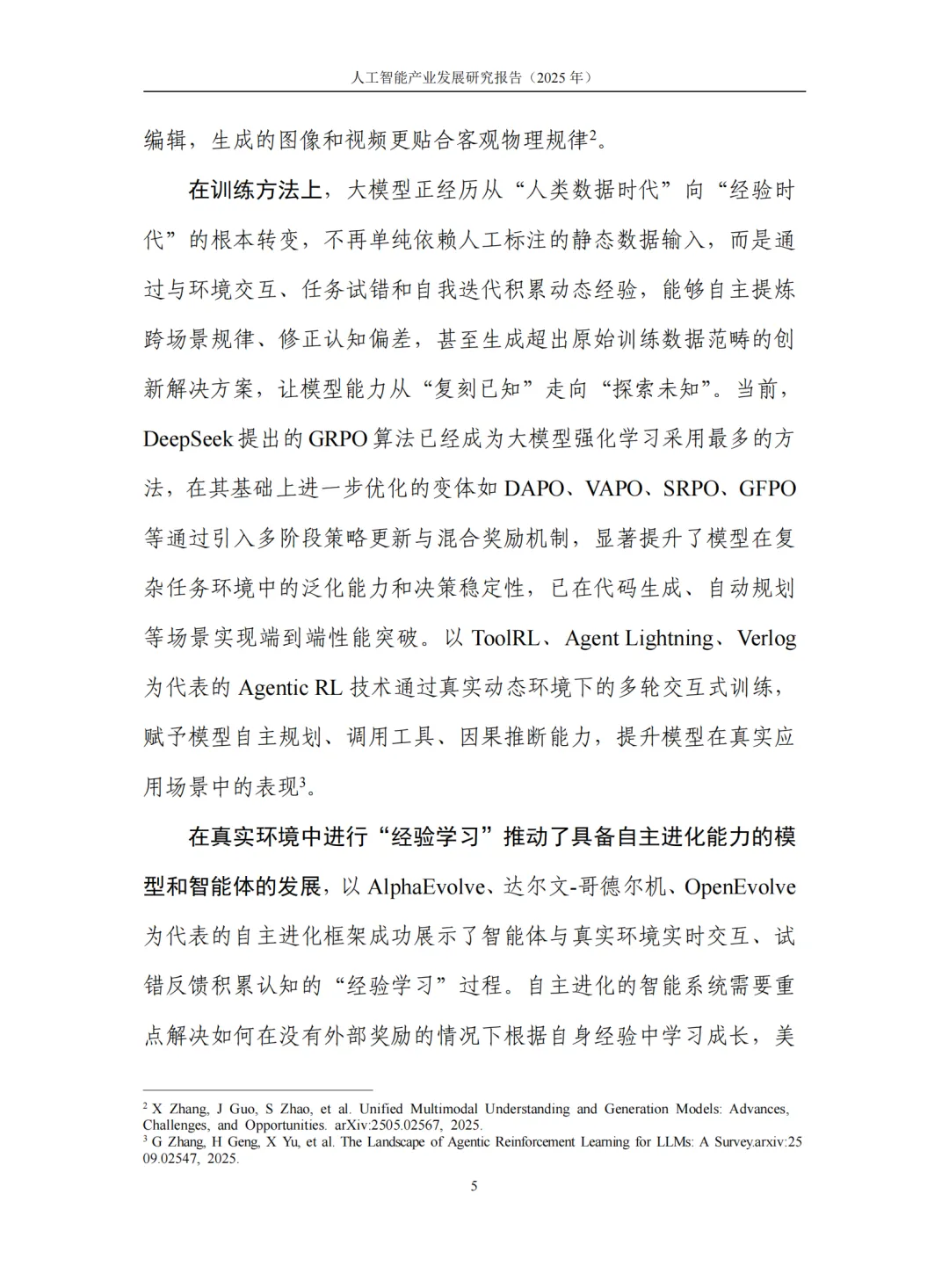 报告提出一个深刻判断:大模型正从"人类数据时代"向"经验时代"演进。传统模型依赖人工标注的静态数据输入,而新一代模型通过与环境交互、任务试错和自我迭代积累动态经验,能够自主提炼跨场景规律、修正认知偏差,甚至生成超出原始训练数据范畴的创新解决方案。