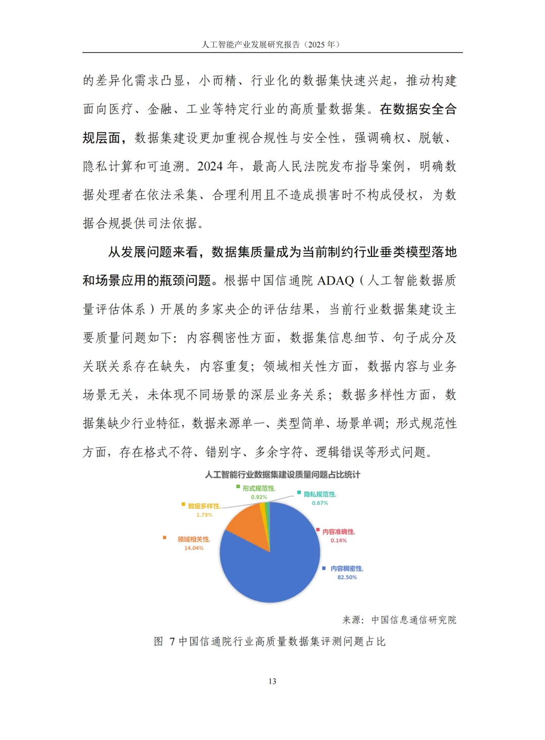中国信通院ADAQ评估揭示行业数据集建设的严峻质量瓶颈:内容稠密性缺失占比高达82.50%,领域相关性不足占14.04%,数据多样性、形式规范性等问题亦十分突出。这推动数据工程向智能生成、多元专业、合规治理三个方向深化:海天瑞声"标-训-推"一体化数据处理模式,行业化高质量数据集建设,以及围绕确权、脱敏、隐私计算的数据可信体系。