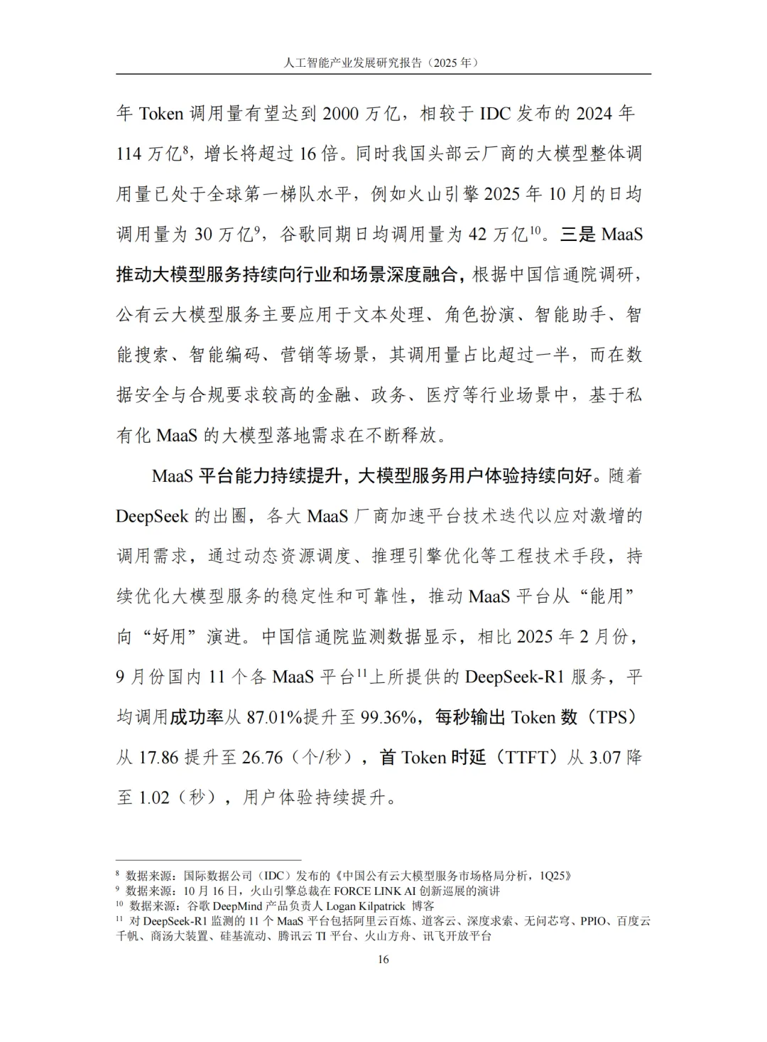 需求爆发,动能强劲。 一个更具指标意义的数据是:2025年我国公有云大模型(对客侧)Token调用量约2000万亿,相较于2024年的114万亿,增长超过16倍。以火山引擎为例,2025年10月日均调用量已达30万亿,与谷歌同期水平(42万亿)同处全球第一梯队。这种爆发式增长表明,大模型正从"技术尝鲜"转变为"生产刚需",人工智能加速从"能思考"向"能实干"转变,为千行百业开拓赋能新空间。