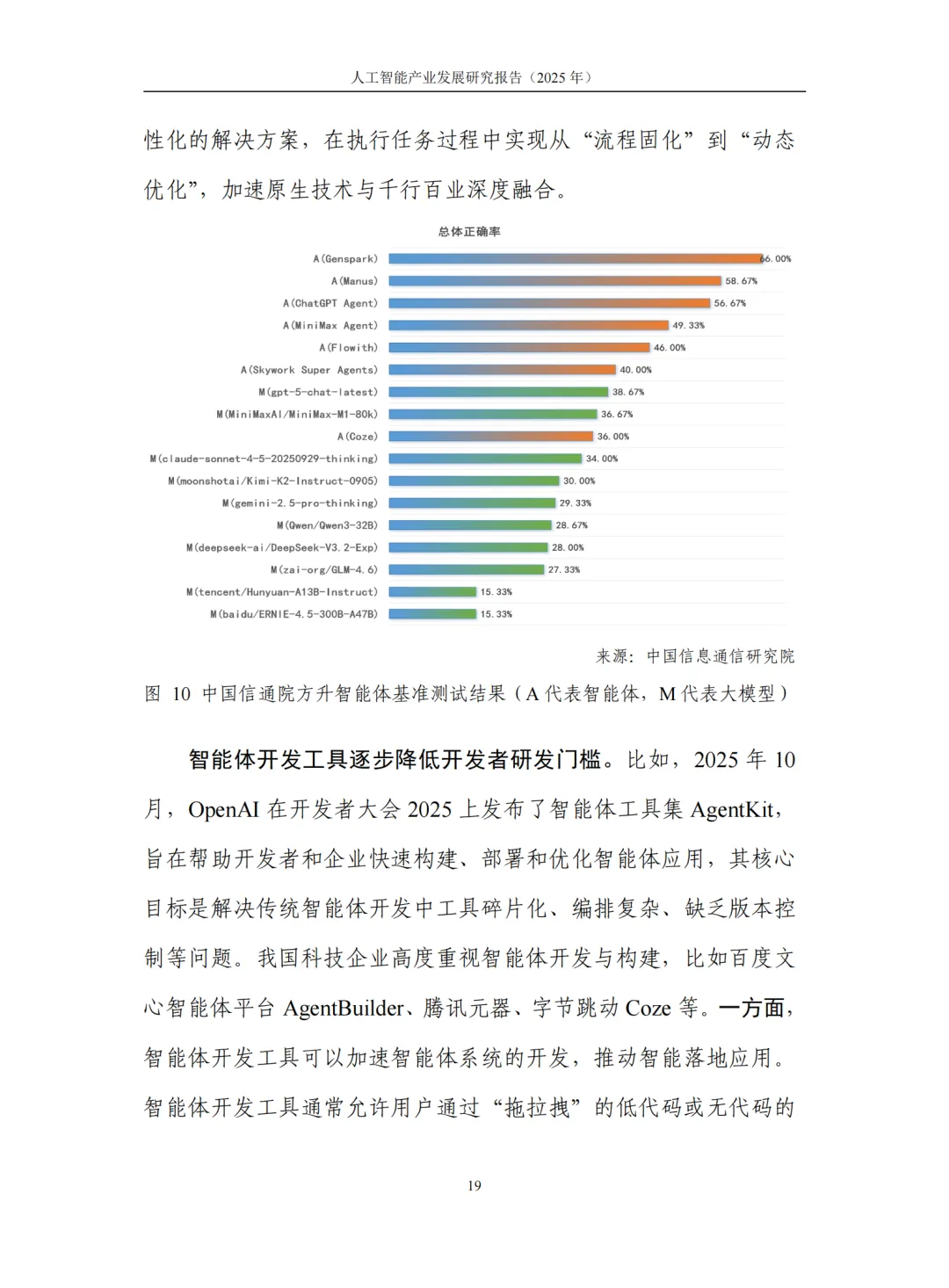 智能体(AI Agent)成为大模型价值释放的主要形态。中国信通院"方升"智能体基准测试显示,高度封装的通用智能体产品可以获得比顶级大模型更好的性能表现——Genspark、Manus等智能体总体正确率分别达66%和58.67%,显著高于纯模型表现。