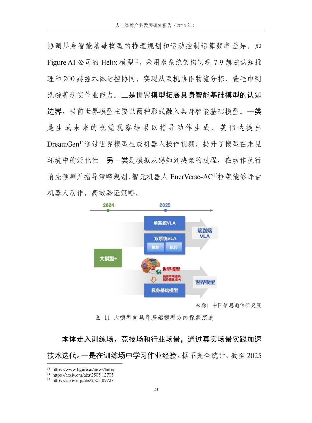 端到端VLA(视觉-语言-动作)架构加速探索,分为两大路径:单系统架构(如智元GO-1)在统一模型内完成感知、决策和动作生成;双系统架构(如Figure AI Helix)协调认知推理(7-9Hz)与运动控制(200Hz)的运算频率差异,实现复杂现实作业能力。