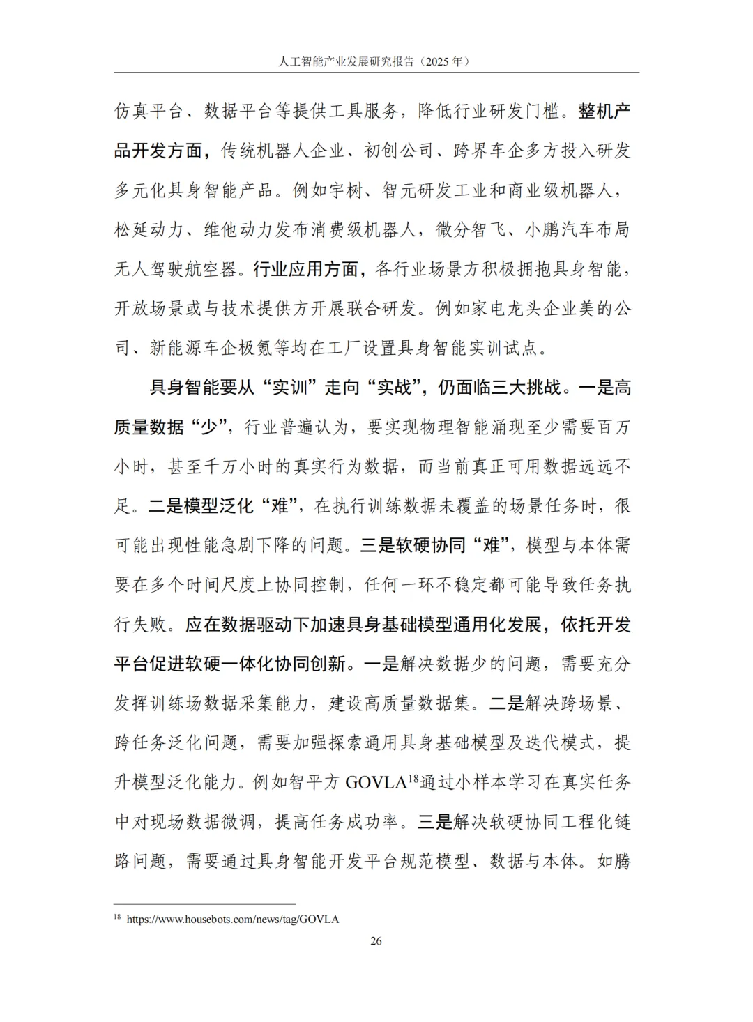 报告清醒指出,具身智能要实现全面商用,仍需克服三大瓶颈:高质量真实行为数据短缺(行业认为需百万甚至千万小时,当前远不足够)、跨场景任务泛化困难(未覆盖场景性能急剧下降)、软硬协同稳定性不足(多时间尺度控制任何一环失效都导致任务失败)。