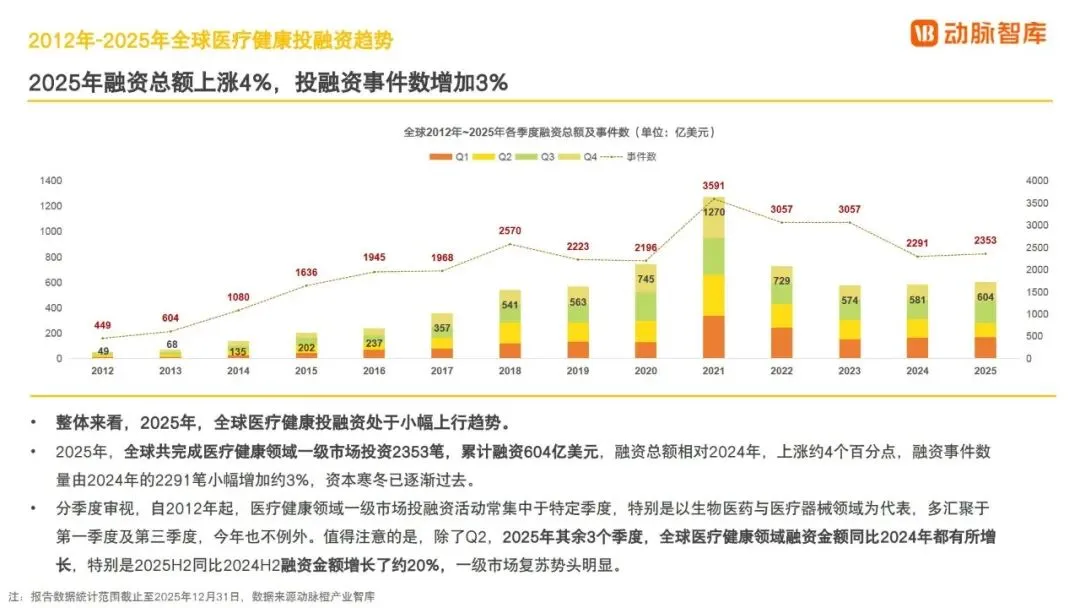全球医疗健康投融资市场逐步走出寒冬,呈现小幅上行态势,全年完成2353笔融资交易,总额达604亿美元,同比分别增长3%和4%。国内市场复苏势头更为强劲,融资金额同比大涨32%,达96亿美元。资本向头部机构集中趋势显著,技术成熟度与商业化路径成为核心考量,人工智能与医疗健康各细分领域深度融合,成为最受关注赛道。港股成为IPO主战场,创新药表现突出;中国创新药海外BD交易创历史新高,全球并购聚焦高价值标的,医疗器械与创新药领域整合活跃。行业正从量的扩张转向质的聚焦,硬核技术、产业协同与清晰商业化逻辑成为穿越周期的关键。