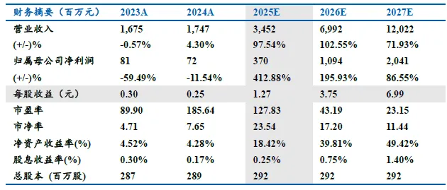 公司是稀缺的光电互连综合提供商,与谷歌在MPO领域有长期稳定的合作供应关系,同时在光模块、AOC等有源产品长期布局,有望成为谷歌算力扩容核心受益标的,数通业务有望实现快速增长。预计2025-2027年公司营业收入分别为34.52/69.92/120.22亿元,归母净利润分别为3.70/10.94/20.41亿元,对应EPS分别为1.27/3.75/6.99元,对应PE分别为128/43/23倍,予以“买入”评级。