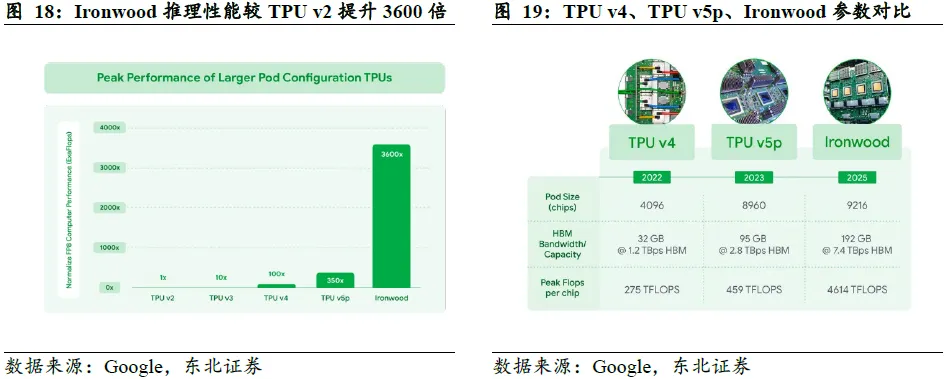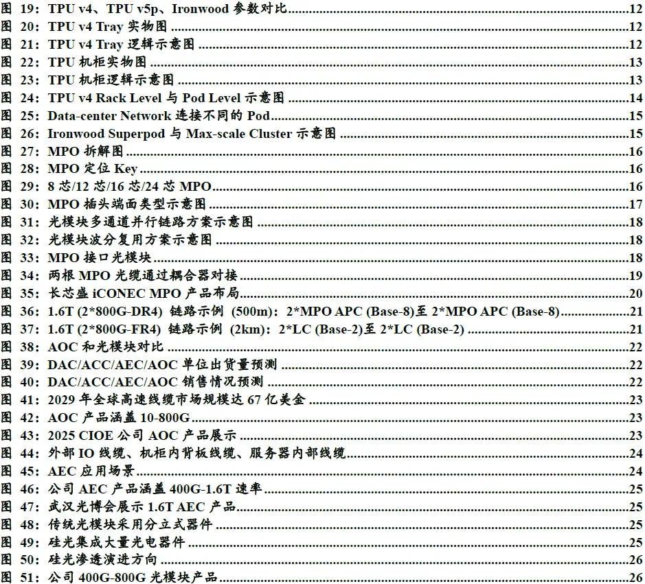 综上,对于64卡机柜,TPU与光模块的比例为1:1.5;TPU与铜缆的比例为1:1.25。谷歌单一机柜内TPU数量将稳定保持在64卡,最新的TPU v7/v8将延续4×4×4架构。因此,TPU的光铜配比保持不变。