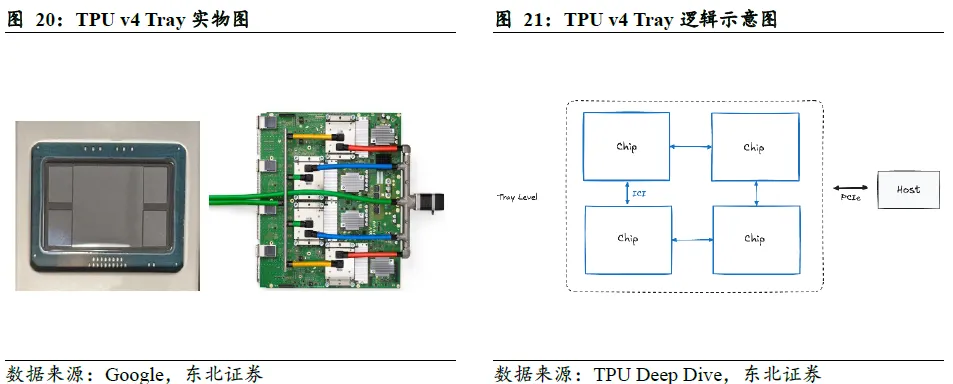 单个Tray包含4个TPU芯片,TPU与TPU之间使用PCB走线互连。每个TPU配备4个OSFP接口,可以选择插入铜缆也可以选择插入光模块,根据TPU所在不同的逻辑位置会有区分。每个TPU另配1个CDFP PCIe接口连接至计算托盘背面的CPU。