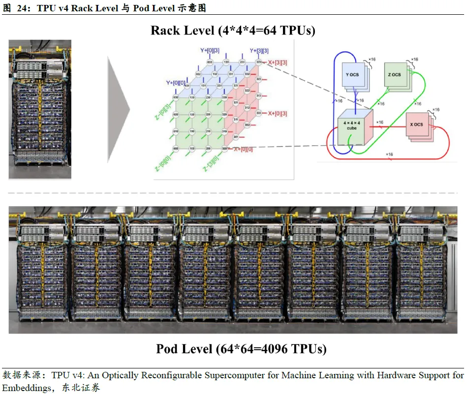 TPU机柜(也称为cube)由64个TPU组成,以4×4×4 3D环面方式连接。TPU机架内部跨托盘互连采用铜缆,而每个cube外部的6个面(16个节点),通过光通路与OCS连接。