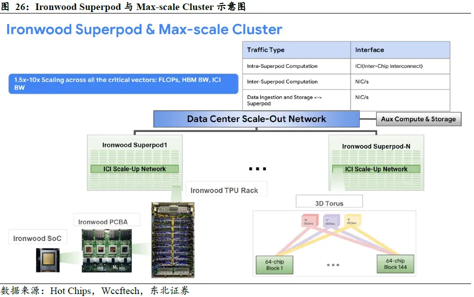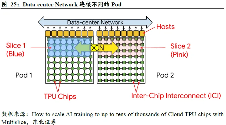若打造万卡集群,则需构建inter-Superpod互连。在更大规模的集群层面,TPU通过数据中心网络(Data Center Network)进行数据交互,各个Pod之间通过CPU host连接至DCN实现横向拓展。根据我们的产业链调研,谷歌不同型号TPU搭配不同速率NIC。NIC到Tor交换机多采用AOC有源光缆实现互连。另外,谷歌scale out网络短距离、高密度的光互连有望带动MPO使用需求。