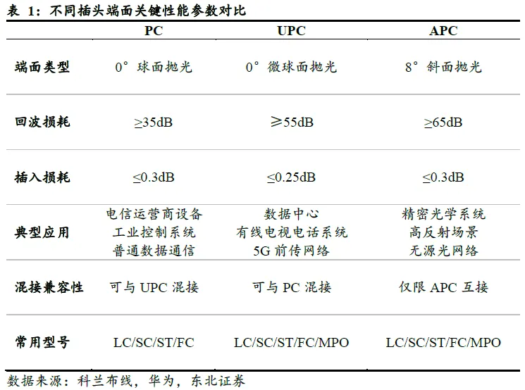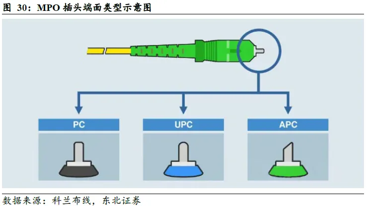 为使光纤连接时获得更好的性能,光纤的端面采用不同的端面设计。端面可以分为PC、UPC和APC,区别是光纤连接器端面抛光形状的不同。目前MPO连接器普遍采用是UPC和APC,APC主要用于高速的互联的需求。
