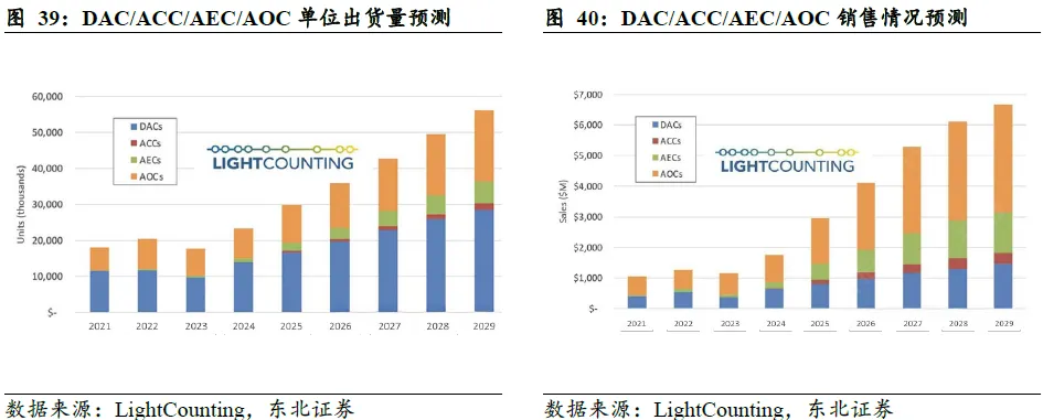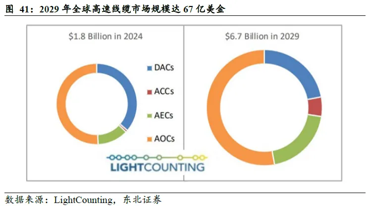 据LightCounting预测,2029年全球高速线缆(DAC+ACC+AEC+AOC)市场规模将达67亿美元。预计AOC市场在2025-2029年将以32%的年复合增长率增长。光纤布线是非常大集群中具有极高光互连密度的最佳选择,AOC是小型和中型集群的可行解决方案。