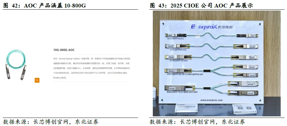 公司数据中心AOC产品涵盖10G-800G速率范围,支持不同封装和长度的Breakout应用。根据我们的产业链调研,公司AOC产品与北美大客户深度合作,部分产品需针对客户需求进行定制化生产。