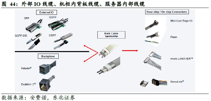 铜连接仍是短距离互连的高性价比方案。散装电缆搭配不同的连接器使用,具体可分为外部IO线缆、机柜内背板线缆、服务器内部线缆:外部IO线主要包括DAC 直连铜缆 (Direct Attach Copper Cable)、ACC有源铜缆 (Active Copper Cable)、AEC有源电缆(Active Electrical Cable),有OSFP、SFP、QSFP等多种接口形式;散装线缆搭配背板连接器组成线缆背板,用于B2B连接;服务器和存储系统内部通过连接器与内部线缆确保高速数据传输性能,主要包括承载PCIe协议线缆(如MCIO/Mini-SAS HD接口)和SAS线缆。