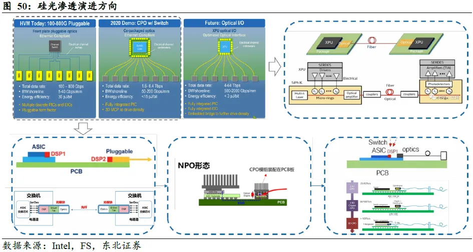 目前硅光主要用于可插拔光模块内部,集成调制器与光波导等无源器件。硅光的渗透从可插拔光模块开始,到CPO再到OIO,层层递进。